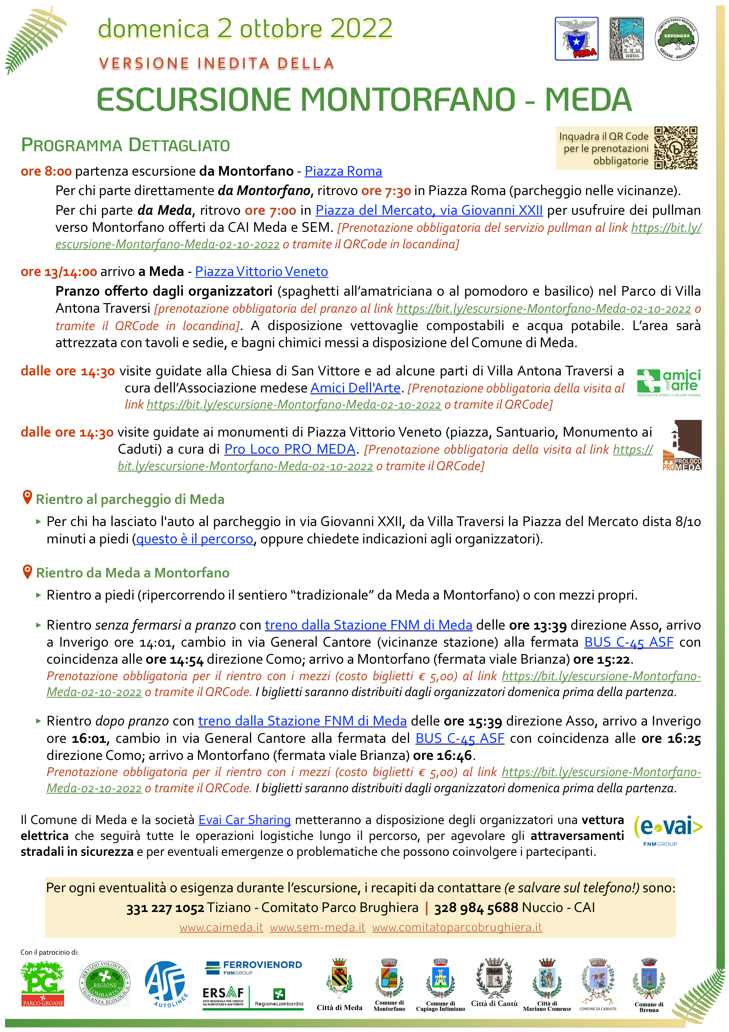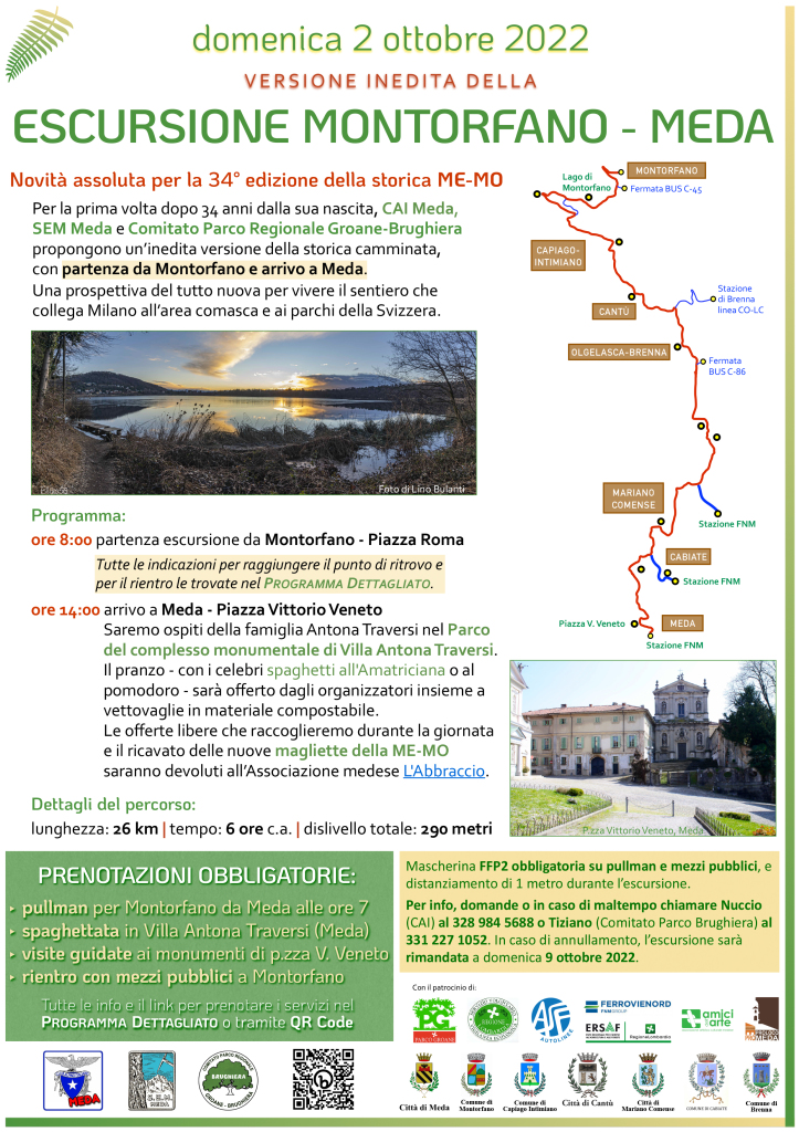Domenica 2 ottobre è invece in programma la camminata Montorfano – Meda. Si può percorrere tutto il suggestivo percorso o anche solo una sua parte. L’arrivo è previsto a Meda dopo le 13:00 nella splendida cornice del Parco Storico di Villa Antona Traversi anche per gustare i “famosi” spaghetti offerti dal CAI e dalla SEM di Meda.