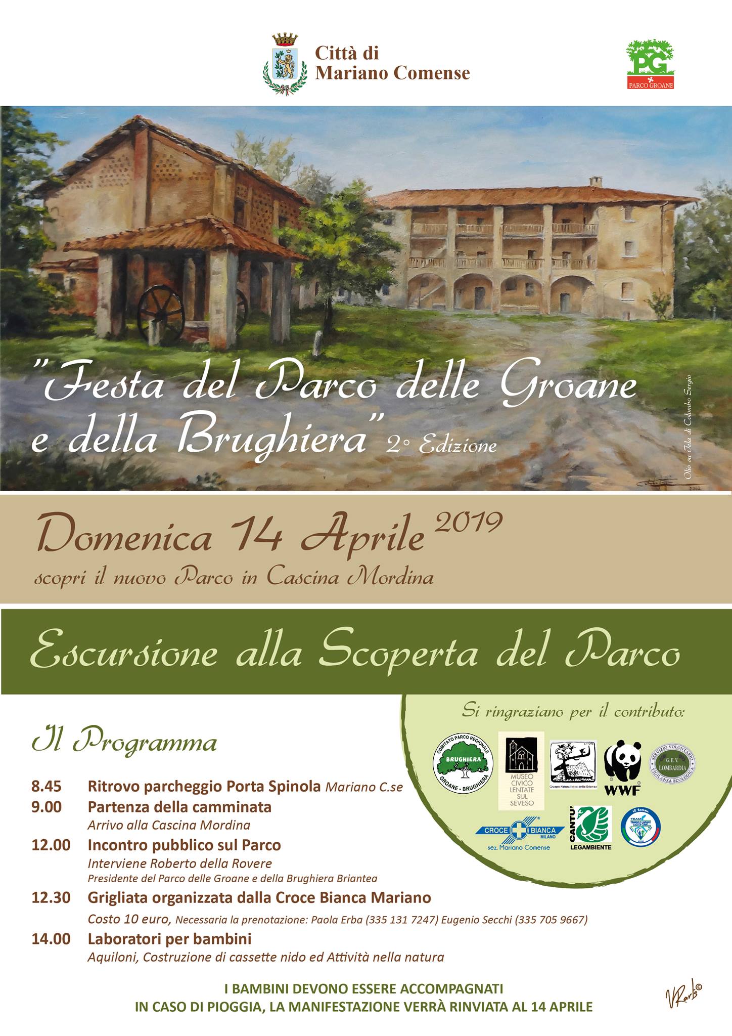 E’ stata definitivamente annullata la seconda edizione della Festa del Parco delle Groane e della Brughiera nell’affascinante location di Cascina Mordina a Mariano Comense. Dopo il rinvio dal 7 al 14 aprile per le cattive condizioni atmosferiche, giovedì 11 aprile il comitato organizzatore ha decisivo per l’annullo a causa ancora delle condizioni meteo non buone per domenica. C’è una timida speranza di riproporla per giugno/luglio ma nulla è ancora certo. Il programma ufficiale prevedeva: