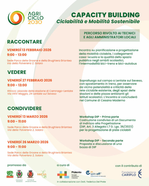 Il Parco Regionale delle Groane e della Brughiera Briantea invita amministratori e tecnici del territorio a partecipare ad AgriCiclo2030, il percorso di capacity building sulla ciclabilità e la mobilità sostenibile, promosso insieme all’Agenzia InnovA21, nell’ambito della Strategia di Transizione Climatica.