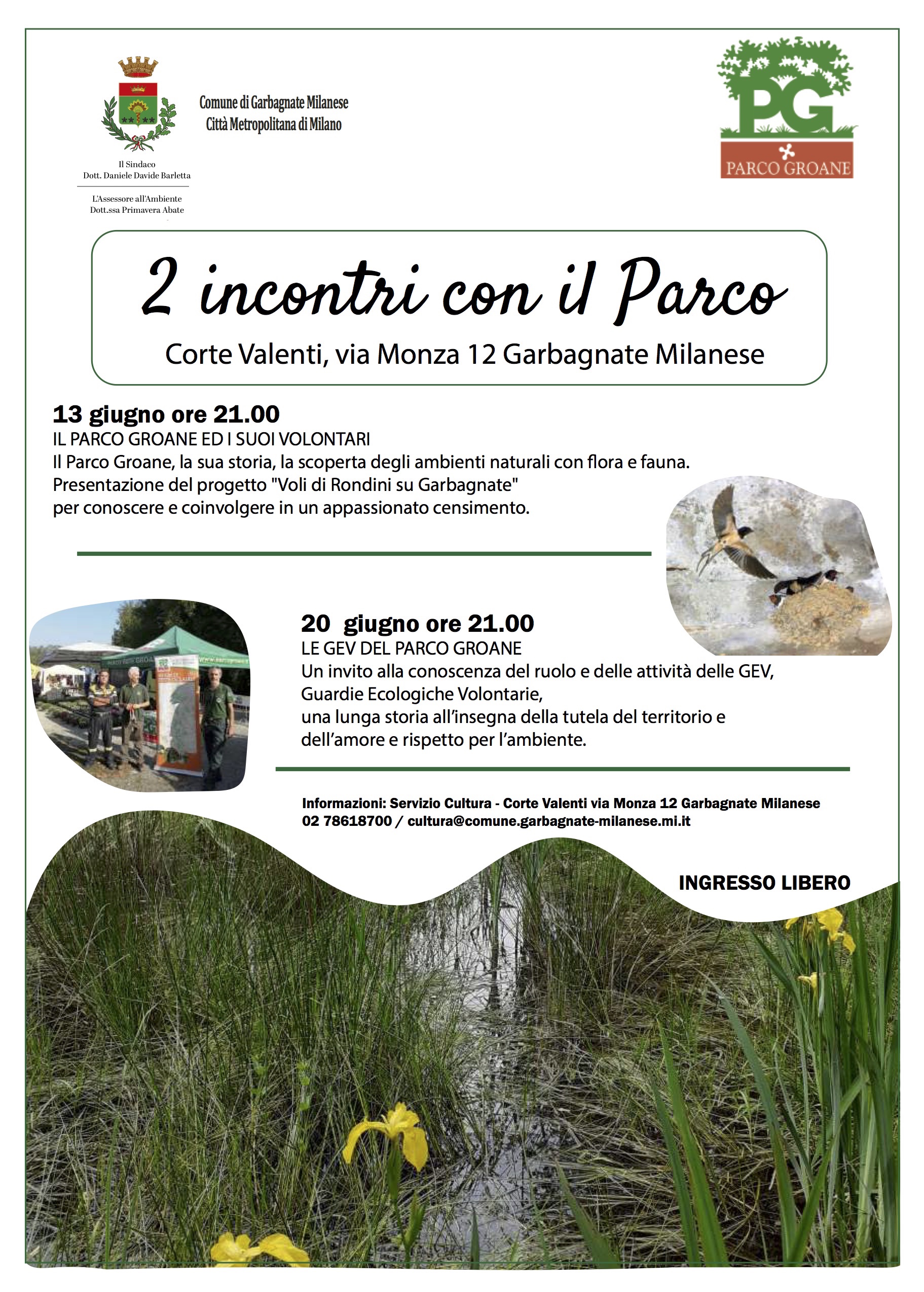 L’evento del 13 giugno alle 21.00 è intitolato “Il Parco Groane e i suoi Volontari” ovvero un viaggio tra la storia delle Groane alla scoperta degli ambienti naturali con la loro fl­ora e fauna. Oltre alle testimonianze delle Guardie ecologiche del Parco verrà presentato il progetto “Voli di Rondini su Garbagnate” per conoscere meglio questi uccelli e coinvolgere la popolazione in un appassionato censimento.