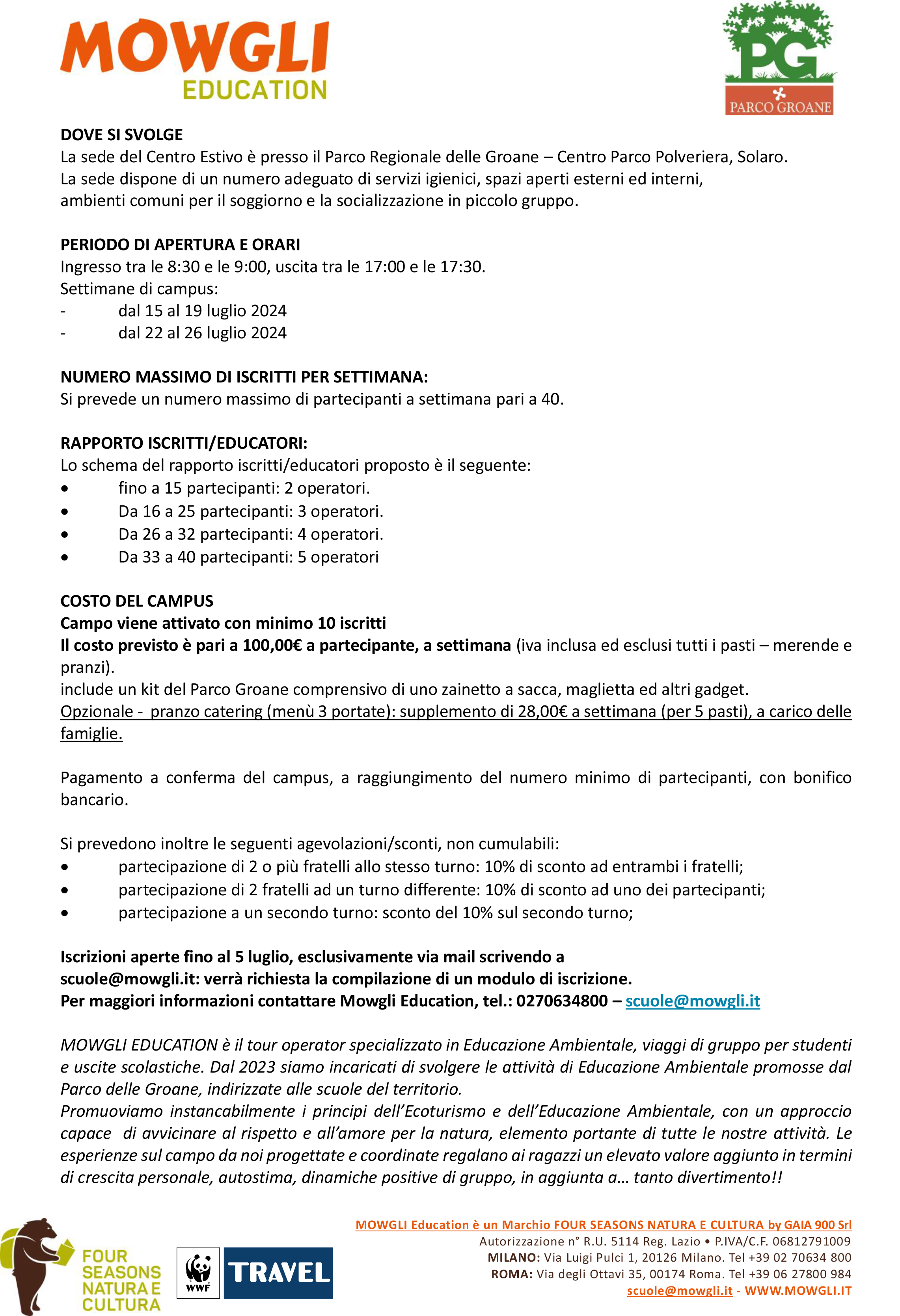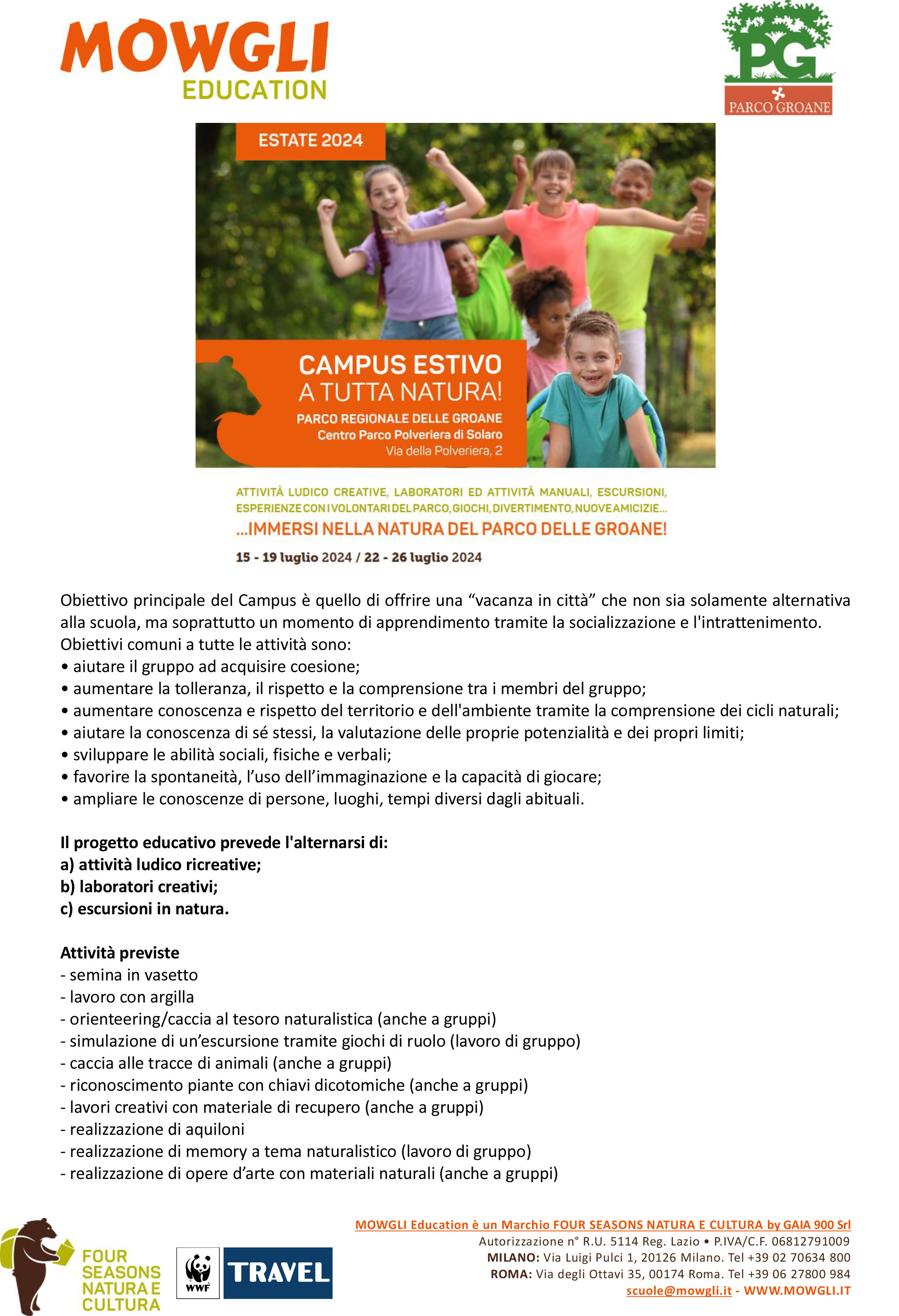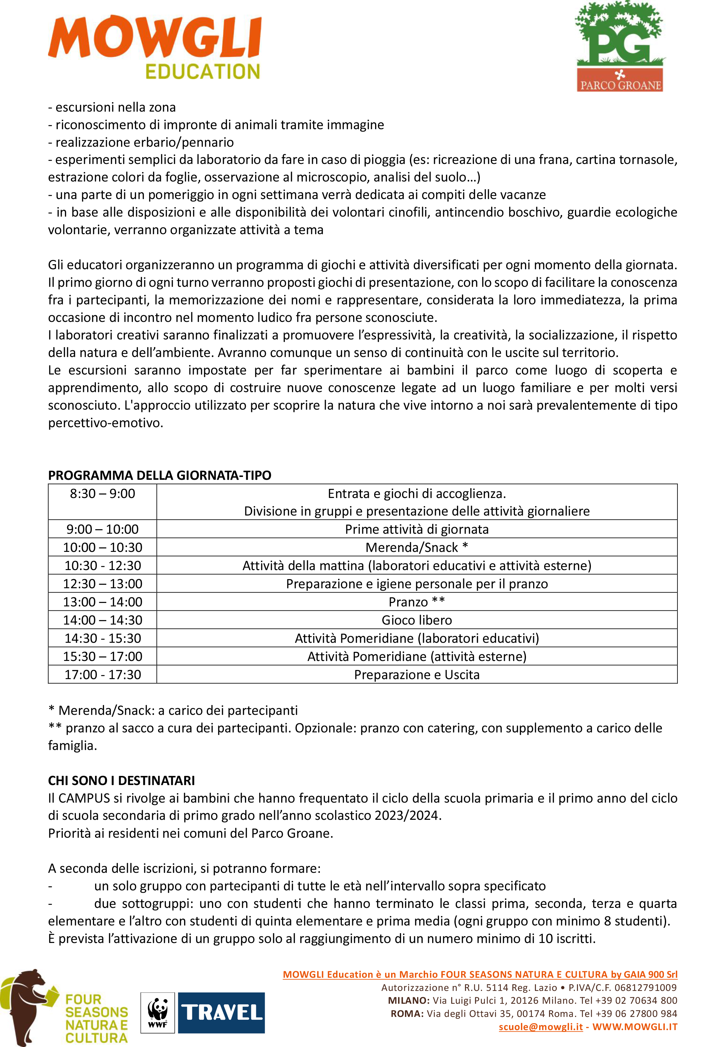 Tutte le attività sono organizzate da Gaia 900 – Mowgli, che dal 2023 è incaricata di svolgere le attività di Educazione Ambientale promosse dal Parco delle Groane e indirizzate alle scuole del territorio. Mowgli Education è il tour operator specializzato in educazione ambientale, viaggi di gruppo per studenti e uscite scolastiche. Promuove i principi dell’ecoturismo e dell’educazione ambientale, con un approccio capace di avvicinare al rispetto e all’amore per la natura.