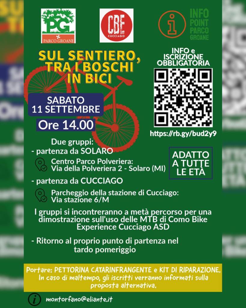 SABATO 11 SETTEMBRE: dalle ore 14.00 fino al tardo pomeriggio. Scelta del luogo di partenza: – Solaro: Centro Parco Polveriera: via delle Polveriera 2 – Solaro (MI) – Cucciago: Stazione di Cucciago: via Stazione 6/M I due gruppi si incontreranno a metà percorso per una dimostrazione sull’uso delle MTB di Como Bike Experience Cucciago ASD. […]