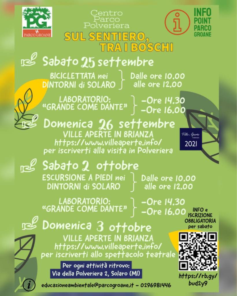 Riprendono le attività di educazione ambientale in Villa Padulli a Cabiate curate dal Parco delle Groane e della Brughiera Briantea tramite la Cooperativa Eliante. Per maggiori informazioni ed iscrizioni potete cliccare il link https://bit.ly/padulli o scansionare il QR code in locandina. Per rimanere aggiornati sulle prossime iniziative e sul progetto potete consultare il sito web dedicato https://www.scuderieartigiane.it/ e la […]