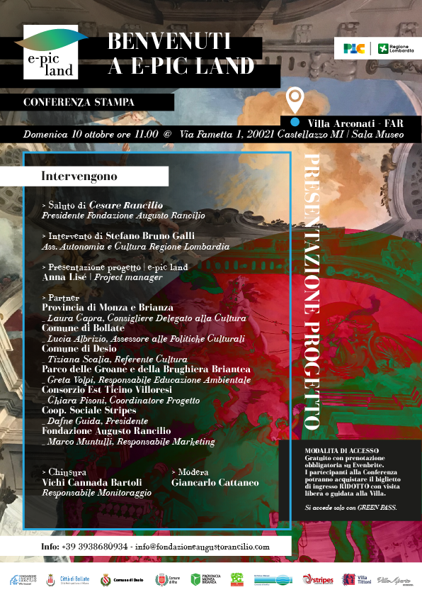 Amici dei Parco, diamo il benvenuto a e-pic land! Domenica, 10 ottobre, ore 11.00 presso la Sala Museo di Villa Arconati Far, ci sarà la conferenza stampa di apertura del progetto “Ri-creare cultura_Ri-generare il patrimonio: Ville di Delizia, Parchi, Acque: strategie integrate azioni innovative tra Brianza e Città Metropolitana “ finanziato da Regione Lombardia nell’ambito dei piani integrati della cultura.