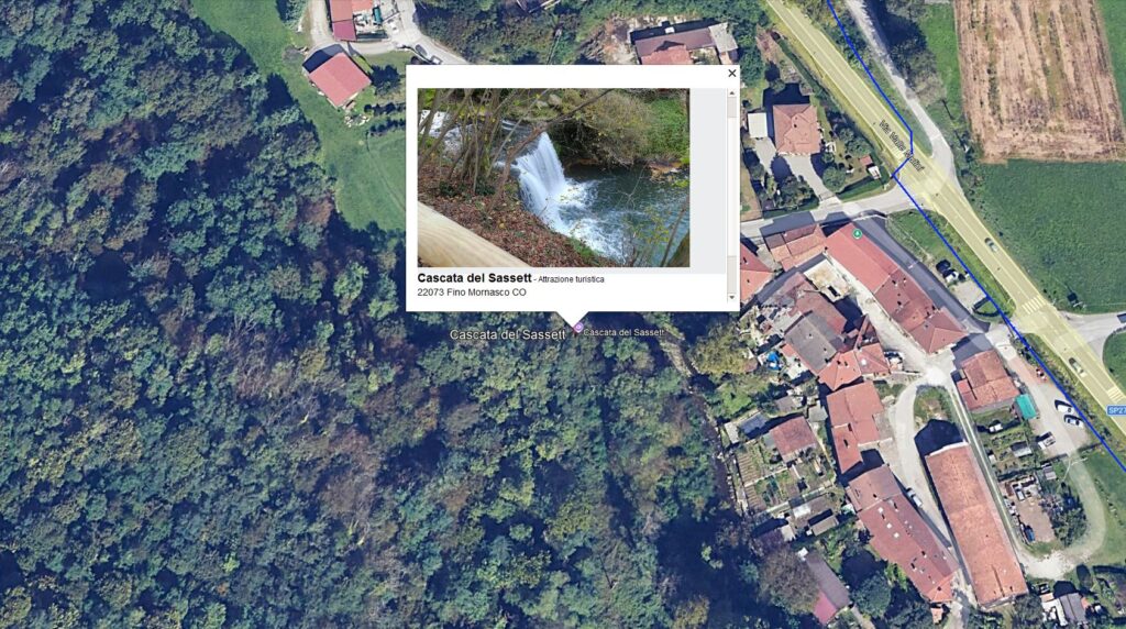 Nell’ultima immagine è indicata anche la collocazione della cascata, per consentire a chi ancora non la conosce di raggiungerla con facilità. Si trova molto vicino alla sede distaccata del Parco presso la Cascina “Emanuela Loi”, situata in via Molinetto (angolo via Valle dei Mulini) a Fino Mornasco.