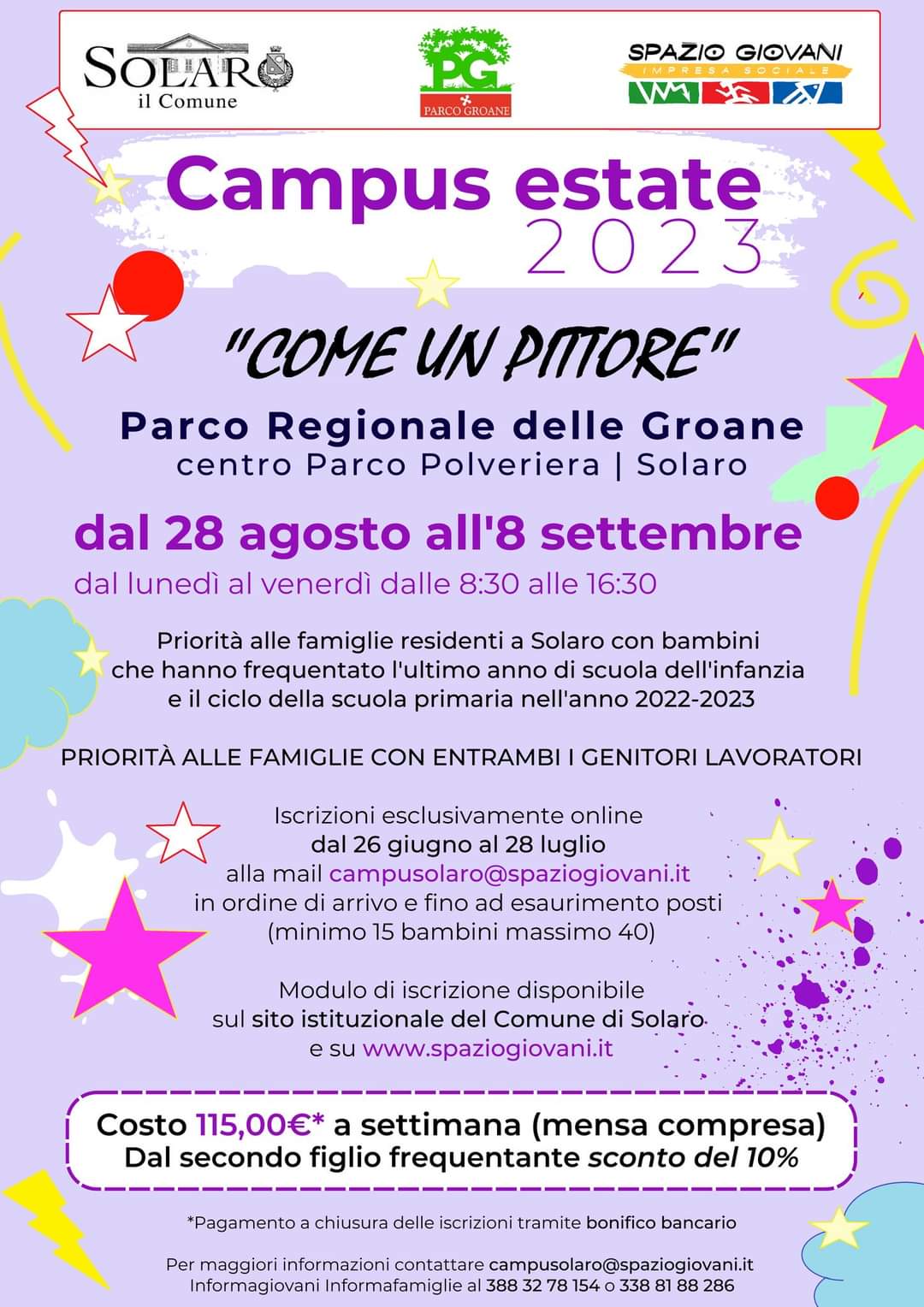 Il Comune di Solaro in collaborazione con il Parco delle Groane e della Brughiera Briantea e con Spazio Giovani Impresa sociale organizzano il campus estivo “Come un Pittore” al Centro Parco Polveriera di Solaro. Le iscrizioni vengono raccolte fino al 28 luglio soltanto online via mail a campusolaro@spaziogiovani.it o dal sito www.spaziogiovani.it