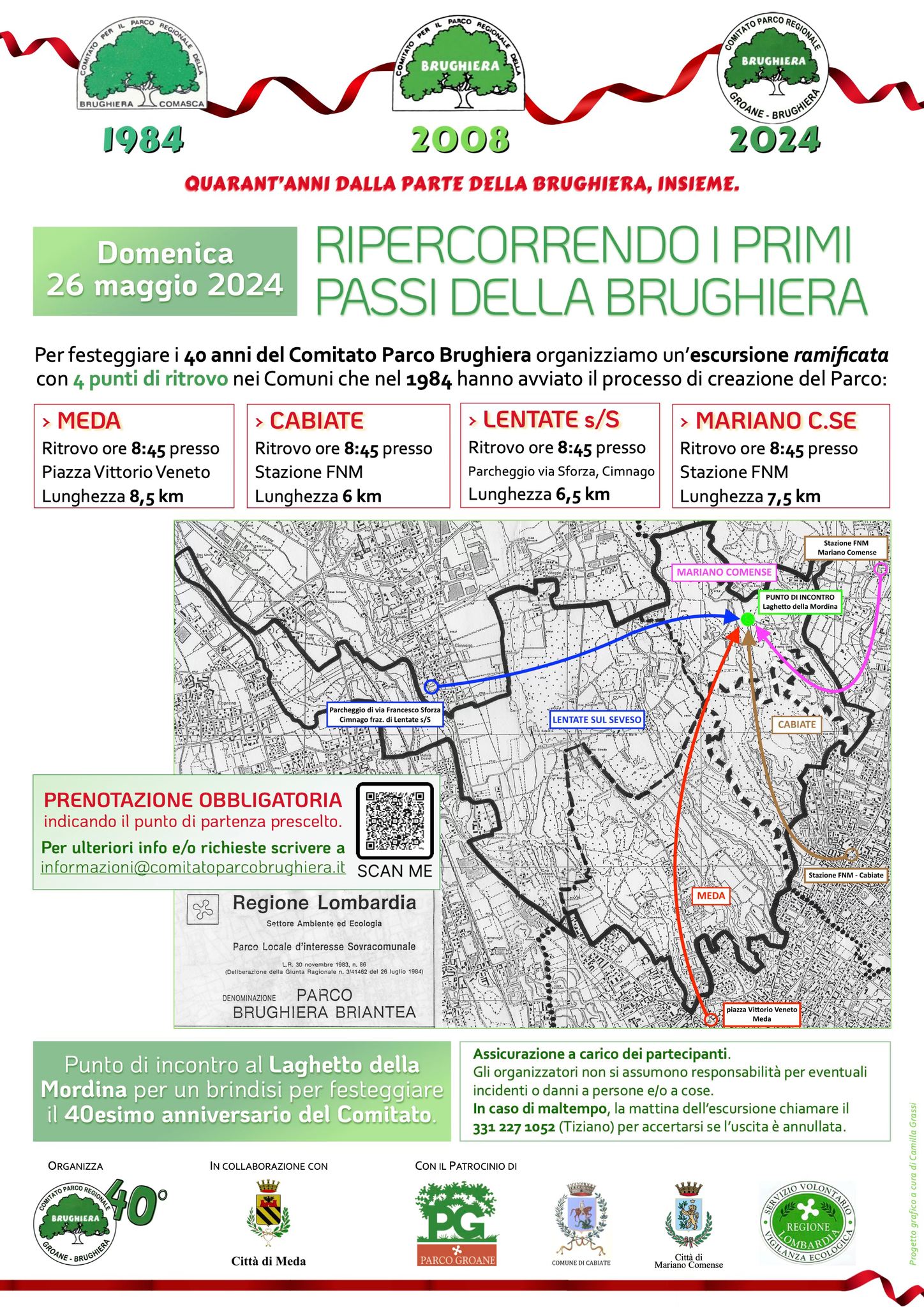 Domenica 26 maggio alle 8.45 la manifestazione “Ripercorrendo i primi passi della Brughiera” un cammino da quattro differenti punti di partenza (Meda, Cabiate, Lentate sul Seveso e Mariano Comense) e arrivo ai Laghetti della Mordina per un brindisi. L’iscrizione alla camminata è obbligatoria, link attraverso il Qr code e mail nella locandina.
