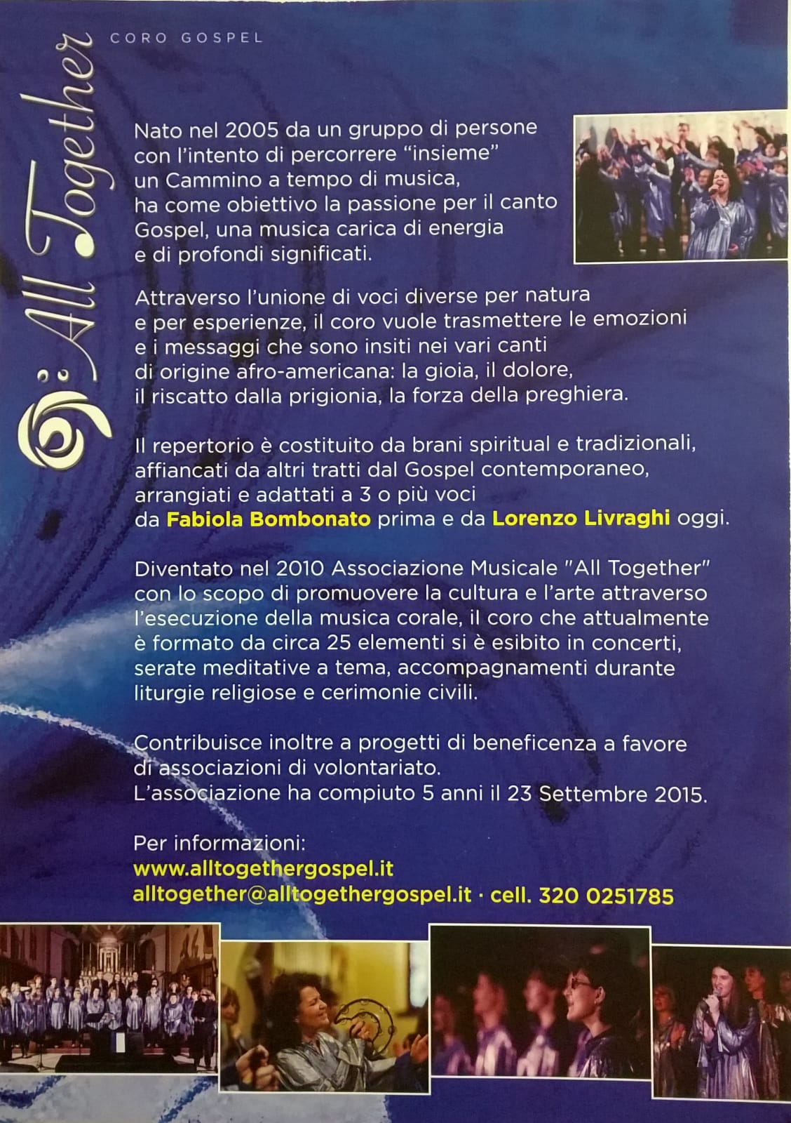 Anche quest’anno in occasione di “Natale al Parco” abbiamo scelto la musica gospel per il tradizionale concerto del Centro Parco Polveriera. Il coro si chiama “All Together” e il suo repertorio è costituito da brani spiritual e tradizionali, affiancati da altri tratti dal Gospel contemporaneo, arrangiati e adattati a 3 o più voci da Fabiola Bombonato prima e da Lorenzo Livraghi oggi.