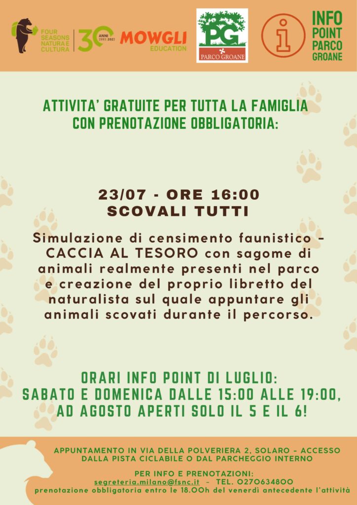 Il prossimo appuntamento è per domenica 23 luglio alle 16 con “Scovali tutti” una Caccia al tesoro con sagome di animali realmente presenti nel nostro Parco delle Groane e della Brughiera Briantea.