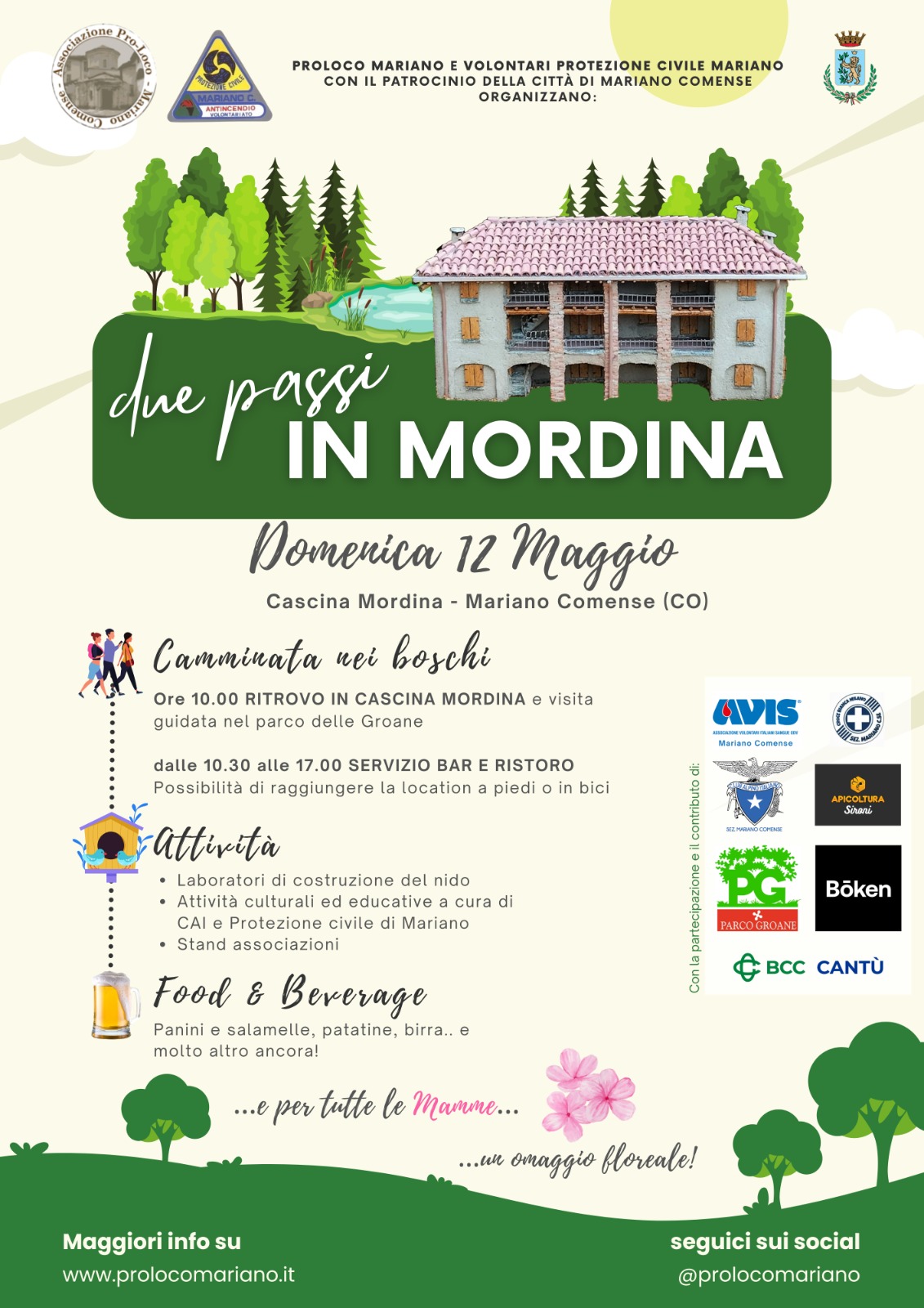 Previste una serie di attività culturali e di educazione ambientale a cura del Cai e della Protezione Civile di Mariano. Un laboratorio insegnerà come costruire un nido. Sarà possibile effettuare passeggiate a cavallo. Alle 15.30 il teatro di figura e narrazione popolare “Laskett, ül Brigant dë la Val di Sass”. Per tutte le mamme è previsto un omaggio floreale. Vi sarà la possibilità di raggiungere la Cascina Mordina sia a piedi sia in bici. Non è necessario iscriversi ai laboratori e alle attività. Si potrà partecipare direttamente durante l’evento. Oltre che del Parco delle Groane “Due Passi in Mordina” conta sul patrocinio della Città di Mariano Comense e del Parco delle Groane, e sulla collaborazione di una serie di realtà: