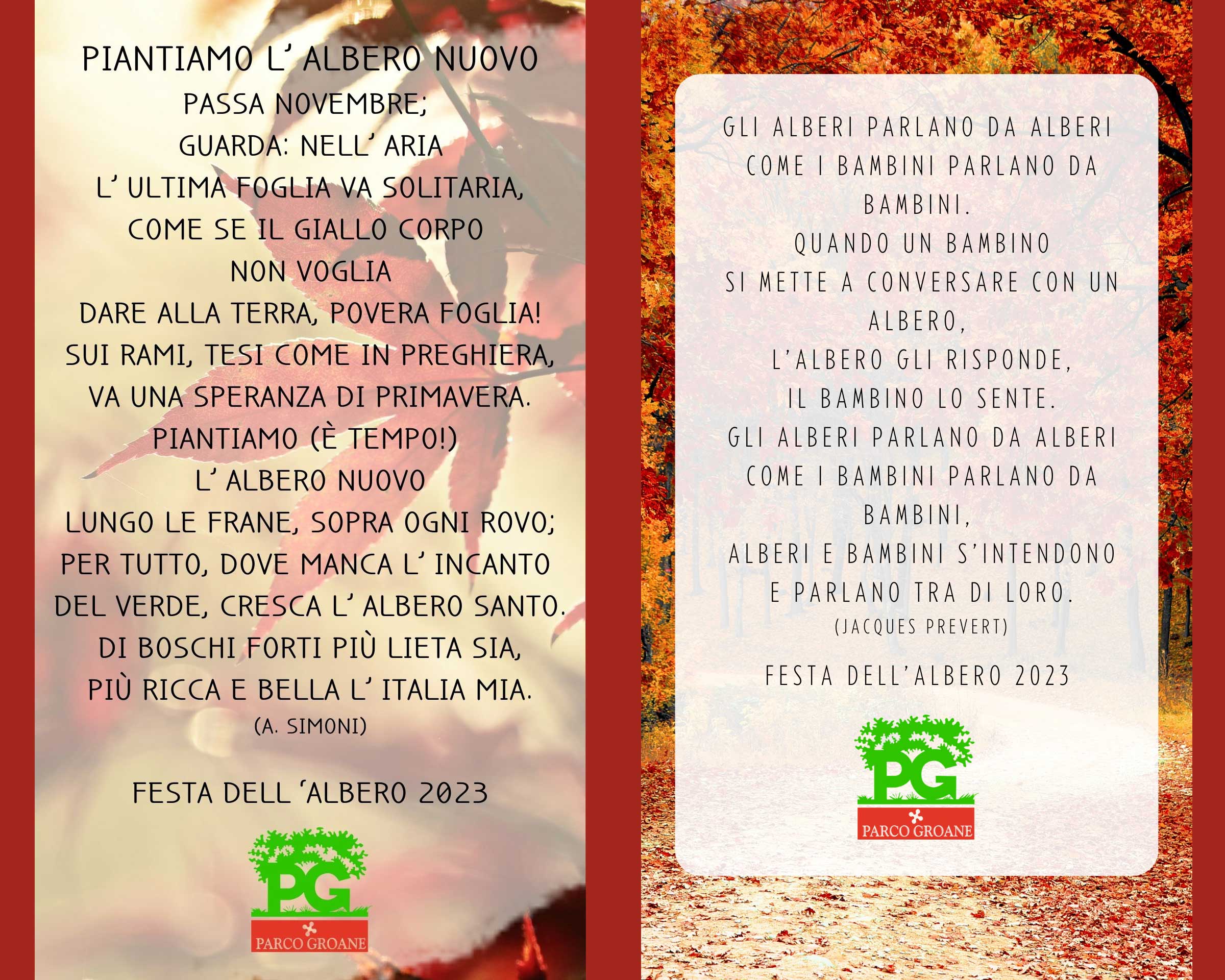 Alle “Giornate degli Alberi” parteciperanno le Gev (Guardie ecologiche volontarie) del Parco durante la semplice cerimonia verrà letta una poesia sugli alberi. Sono due quelle proposte quest’anno, la prima è di Jacques Prévert, la seconda di A. Simoni. Ai partecipanti verranno consegnati anche alcuni gadget del Parco delle Groane.