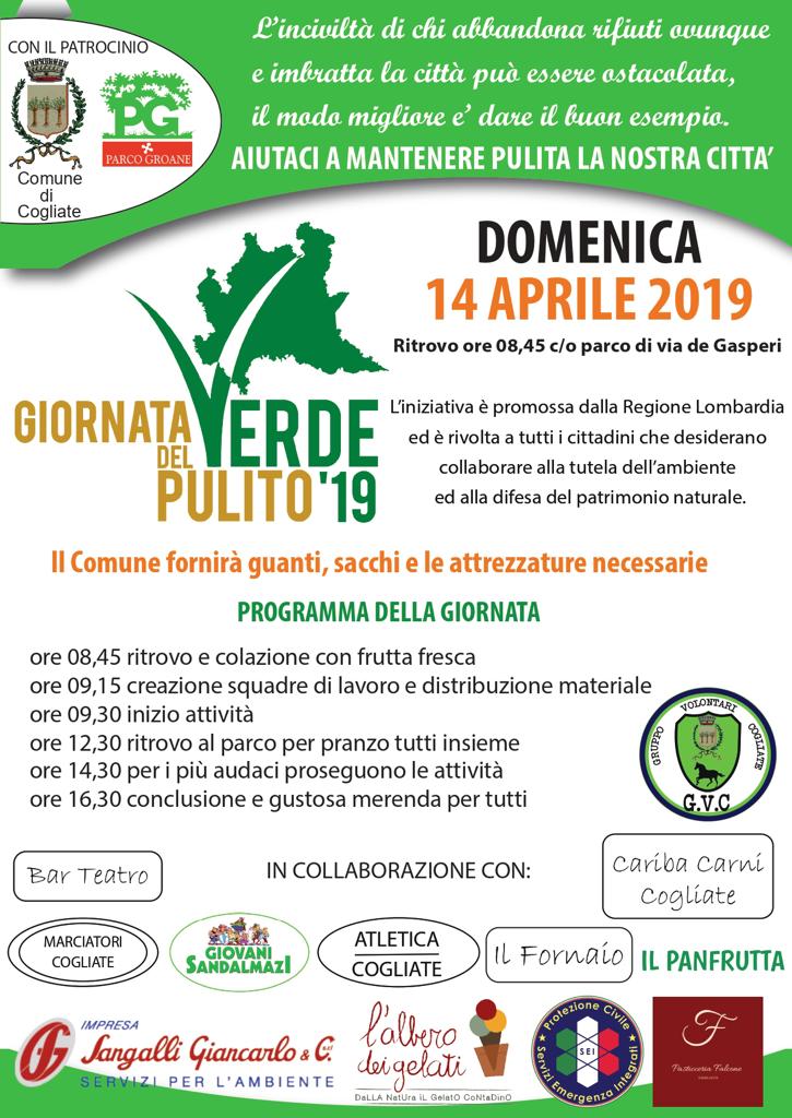 giornata-del-verde-19Domenica 7 aprile è la Giornata del Verde Pulito 2019 istituita con la legge regionale 14/1991. Il Parco delle Groane patrocina, appoggia e, dove possibile, supporta con la presenza delle GEV una serie di appuntamenti promossi dalle varie Amministrazioni Comunali di cui vi forniamo punti di ritrovo e, attraverso la locandina, tutte le informazioni utili. Causa maltempo è stata posticipata a domenica 14 aprile, a sabato 13 nel caso di Solaro. Di seguito i programmi.