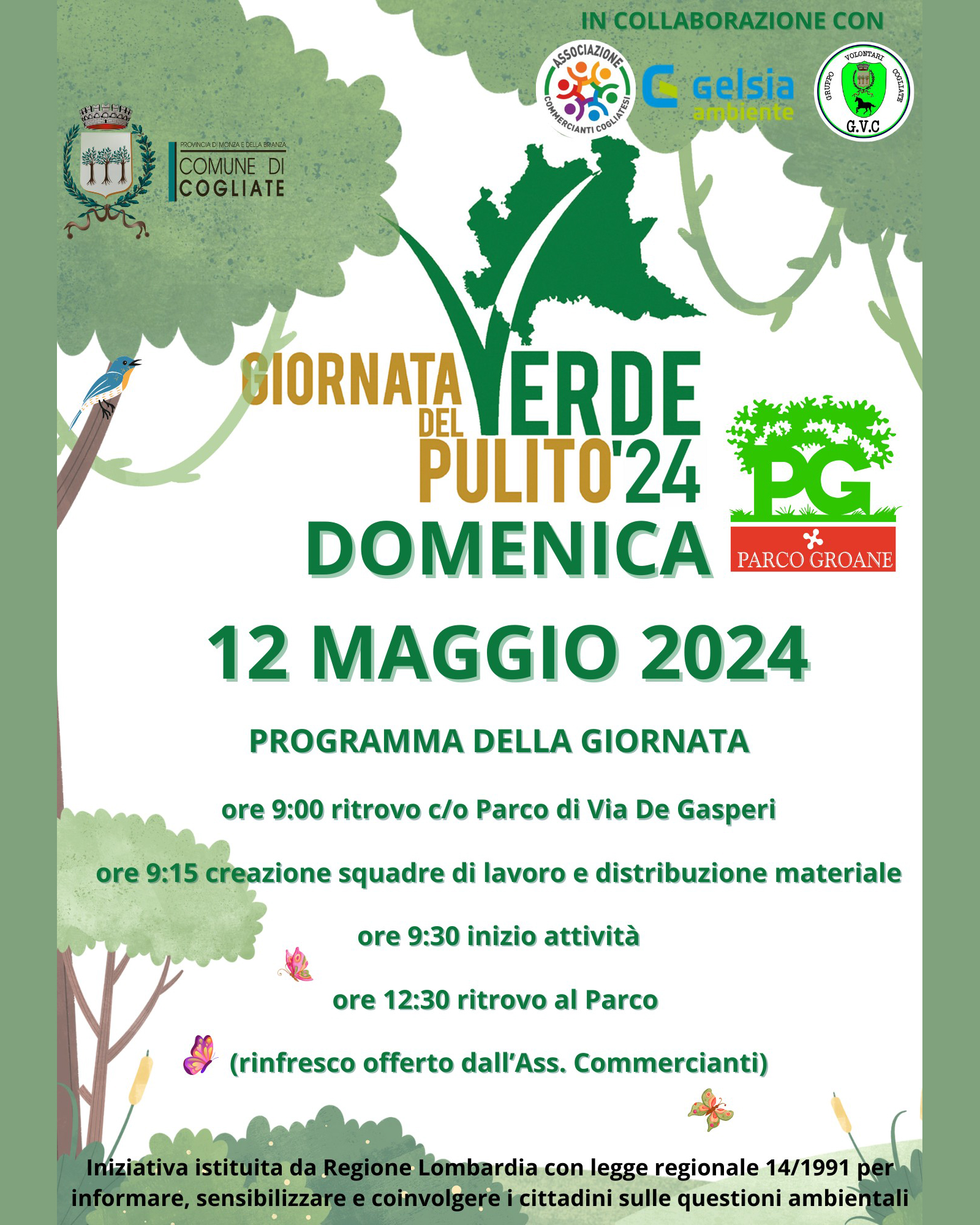 By ComunicazioneIn News10th maggio, 2024Anche il Comune di Cogliate (Monza e Brianza) organizza domenica 12 maggio la Giornata del Verde Pulito. L’appuntamento è per alle 9 al Parco di via De Gasperi. Verranno formate le squadre di lavoro e distribuito il materiale per la raccolta. Alle 12.30 il termine delle attività e il ritrovo al sempre al Parco di via De Gasperi. Per tutti i partecipanti un rinfresco offerto dall’Associazione Commercianti.