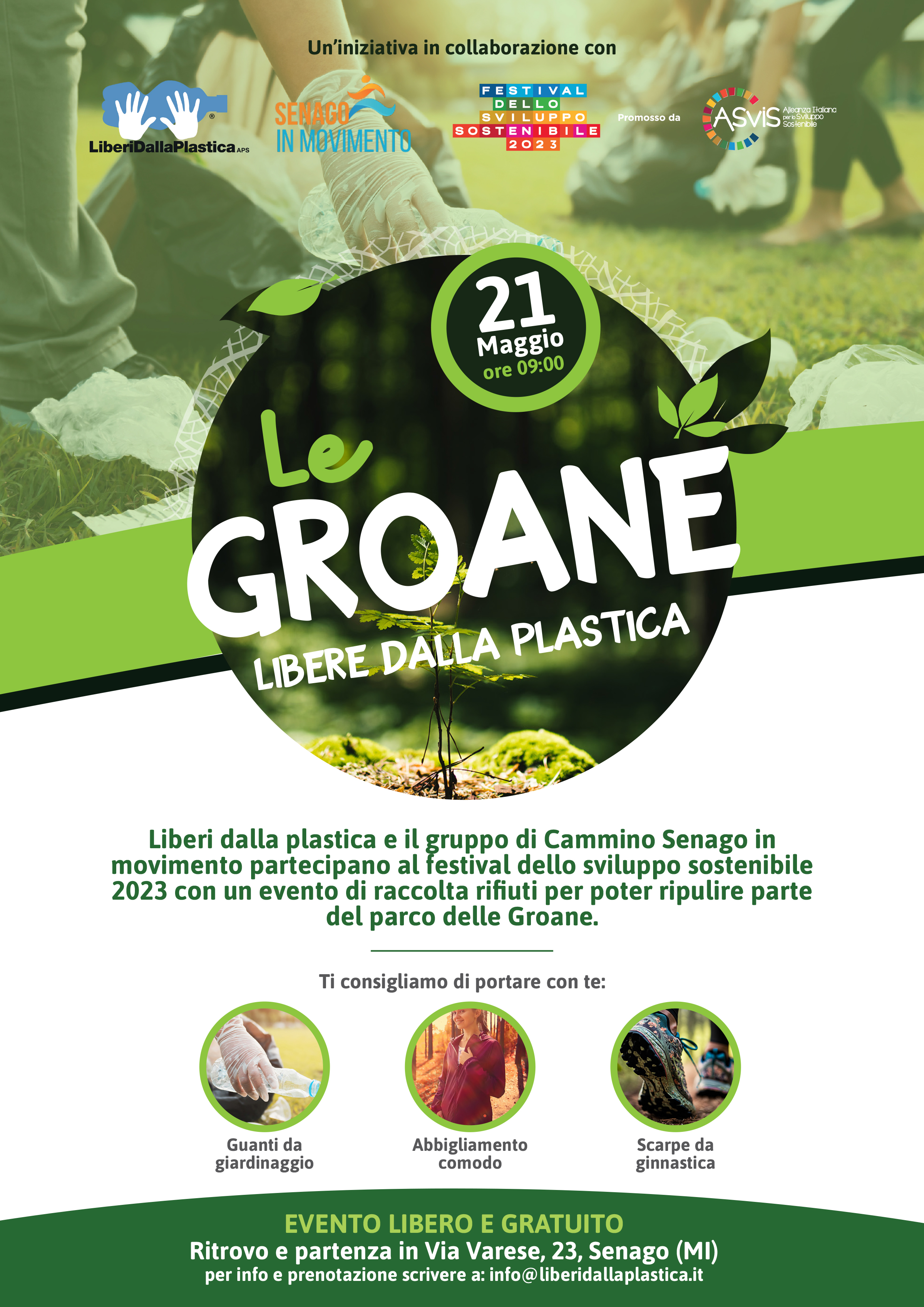 Siamo felici di promuovere l’iniziativa ideata dall’associazione di promozione sociale “Liberi dalla plastica” con sede a Lissone e il gruppo di cammino “Senago in movimento“, in programma domenica 21 maggio a Senago dal titolo “Le Groane libere dalla plastica”. L’appuntamento è alle 9 in via Varese 23 a Senago.