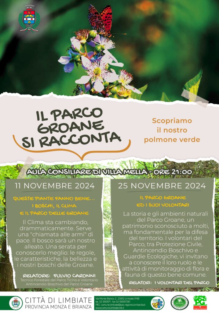 Lunedì 25 novembre sempre alle 21 il secondo appuntamento con “Il Parco delle Groane e i suoi volontari”. Ovvero: “La storia e gli ambienti naturali del Parco Groane, un patrimonio sconosciuto a molti, ma fondamentale per la difesa del territorio. I volontari del Parco, tra Protezione Civile, Antincendio Boschivo e Guardie Ecologiche, vi invitano a conoscere il loro ruolo e le attività di monitoraggio di flora e fauna di questo bene comune”. Relatori della serata saranno gli stessi volontari del Parco delle Groane e della Brughiera Briantea.