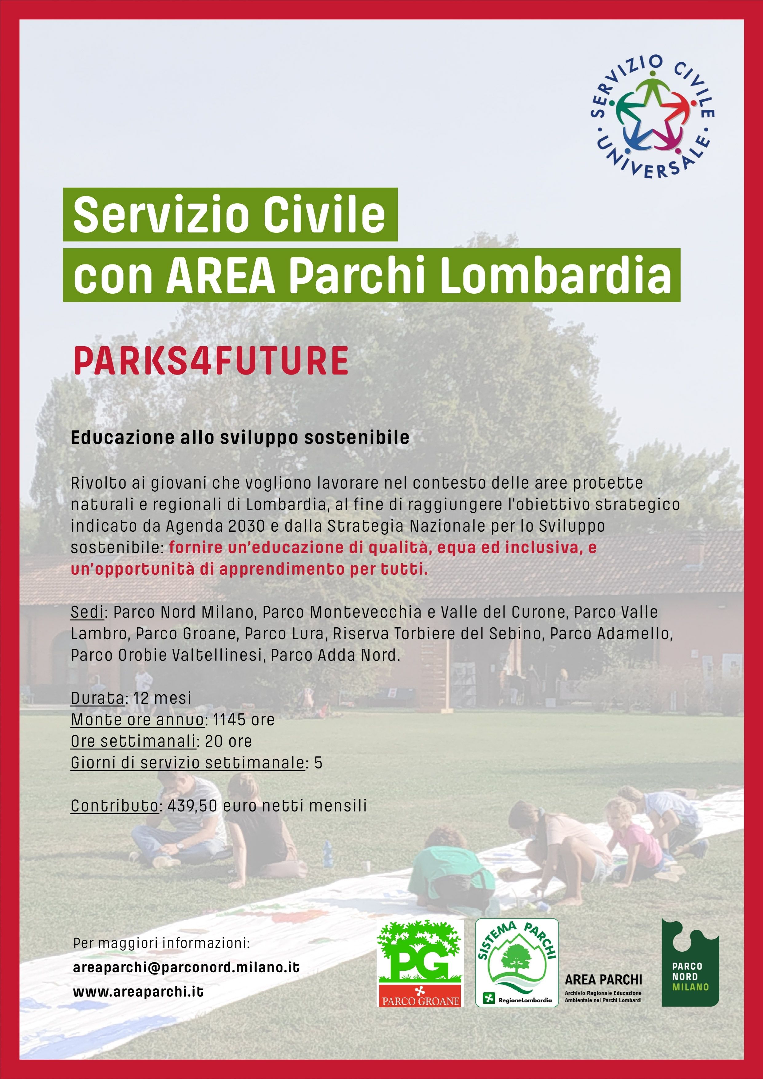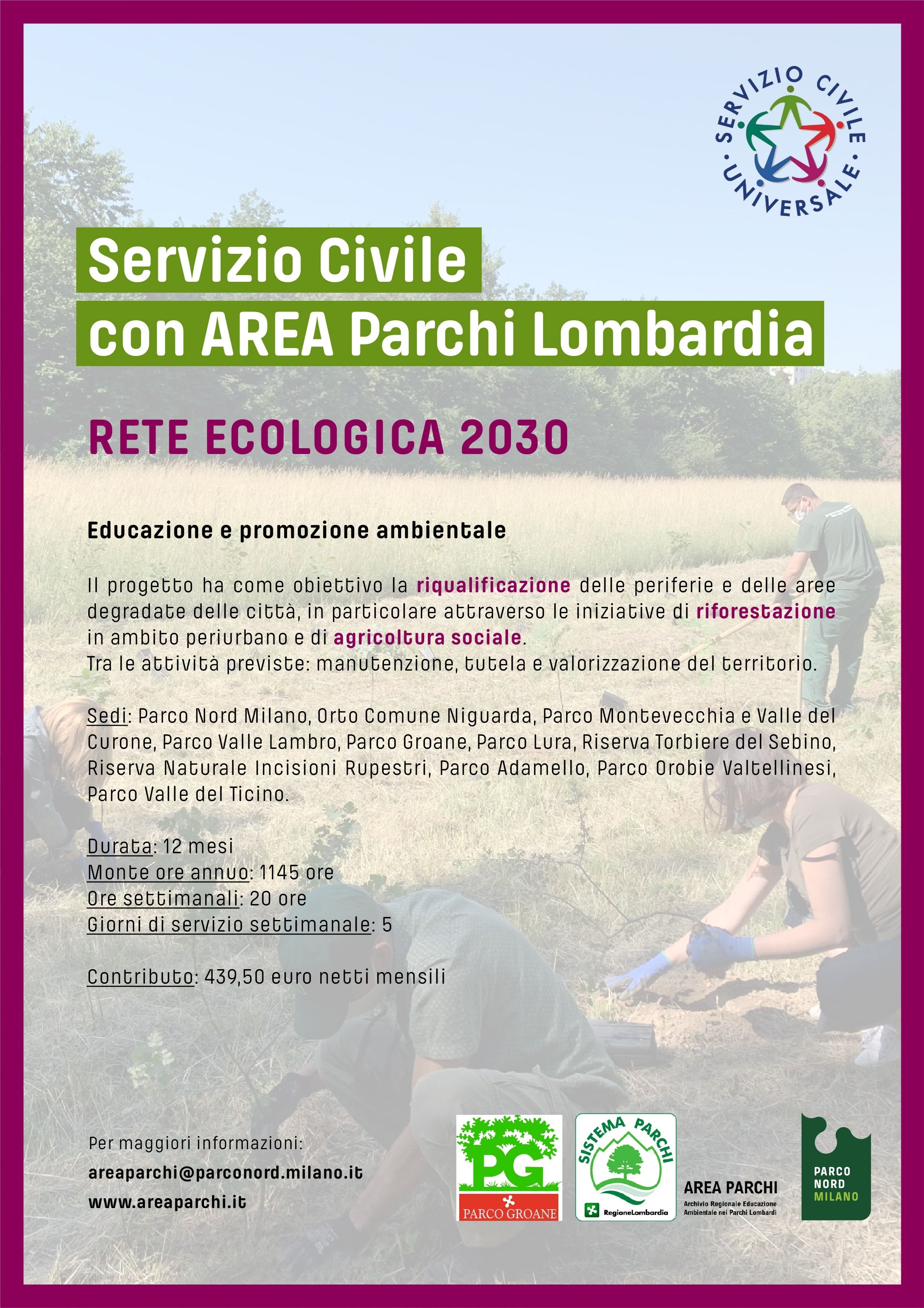 Se hai tra i 18 e i 28 anni partecipa a uno dei due progetti (in tutto sono tre) di Servizio Civile Universale che vedono coinvolti l’Archivio Regionale dell’Educazione Ambientale dei Parchi lombardi (AREA Parchi) e a cui aderisce il Parco delle Groane (2 posti) assieme ad altre 11 aree protette (Parco Adamello, Parco Orobie Valtellinesi, Parco Adda Nord, Parco Montevecchia e Valle del Curone, Parco Nord Milano, Parco Valle Lambro, Parco Valle del Ticino, Parco Lura, Riserva Torbiere del Sebino, Riserva Naturale Incisioni Rupestri Di Ceto, Cimbergo e Paspardo), l’Associazione Orto Comune Niguarda, la Fondazione Cineteca Italiana e l’Associazione Culturale Casa Testori.