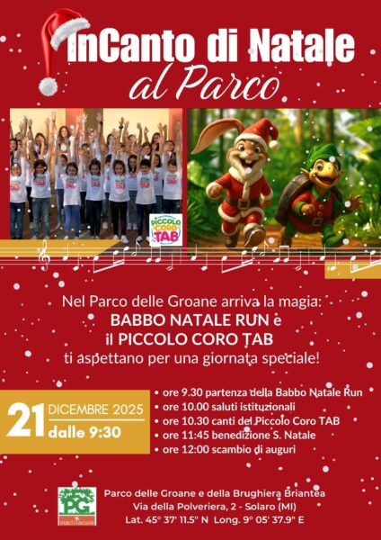 La magia del Natale arriva nel cuore verde del territorio con “InCanto di Natale al Parco”, una mattinata di festa organizzata dal Parco delle Groane e della Brughiera Briantea per domenica 21 dicembre, un’occasione pensata per unire comunità, istituzioni, famiglie e volontari in un abbraccio collettivo fatto di musica, sport, convivialità e spirito natalizio.