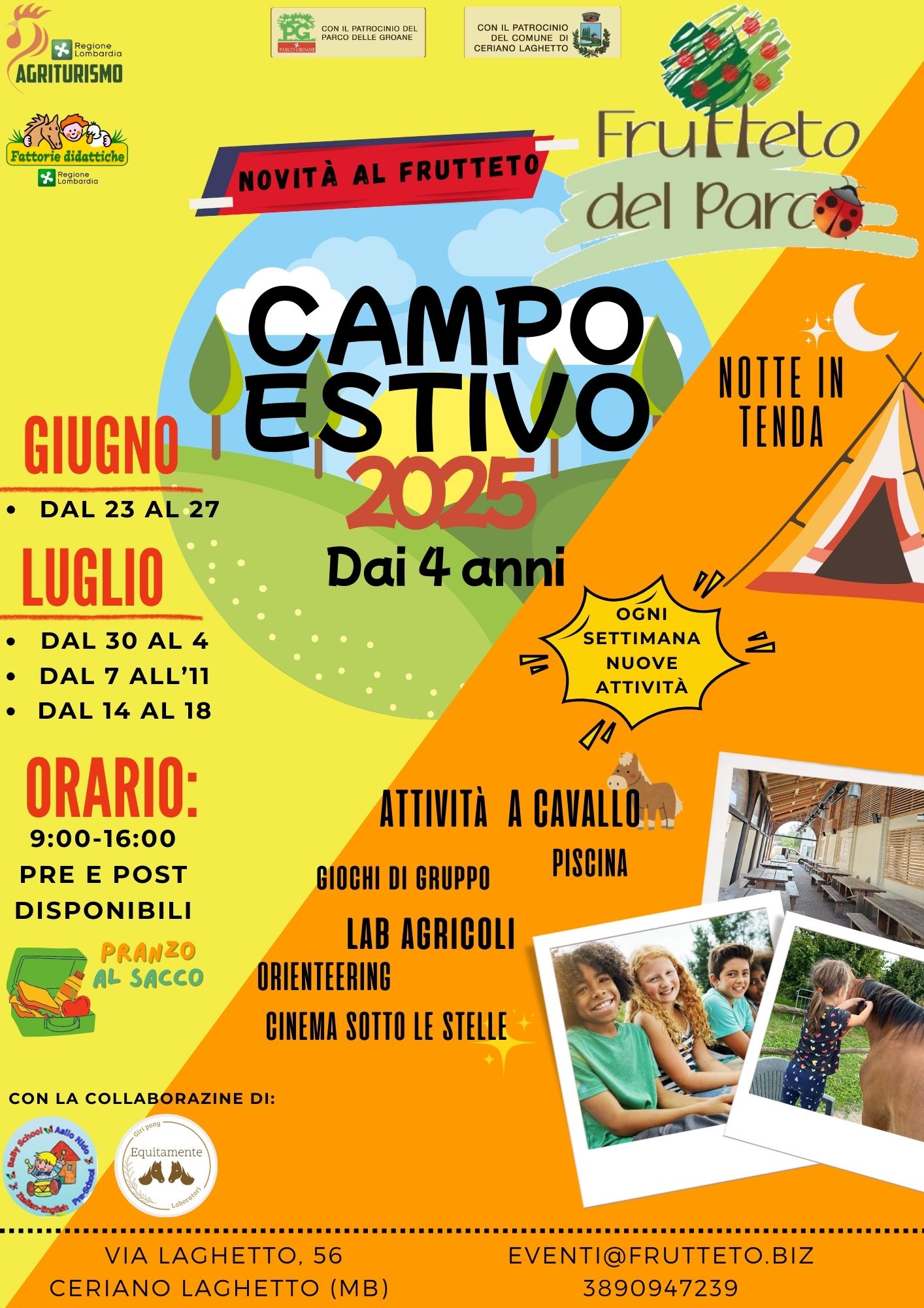 Il Frutteto ha già diffuso anche le date del suo prossimo Campo Estivo. Sono previsti quattro turni tra giugno e luglio. A giugno dal 23 al 27, a luglio dal 30 al 4, dal 7 all’11 e dal 14 al 18. L’orario standard previsto è dalle 9 alle 16, ma c’è disponibili per l’accoglienza prima dell’orario e il post. Il pranzo sarà al sacco. Diverse le attività previste con variazioni ogni settimana. Tra queste giochi di gruppo, piscina, lab agricoli, orienteering, attività a cavallo, cinema sotto le stelle e perfino un’avventurosa notte in tenda. Per informazioni si può inviare una mail a eventi@frutteto.biz o telefonare al 389.0947239. Le attività ricreative del “Frutteto del Parco” hanno il patrocinio del nostro Parco delle Groane e della Brughiera Briantea.