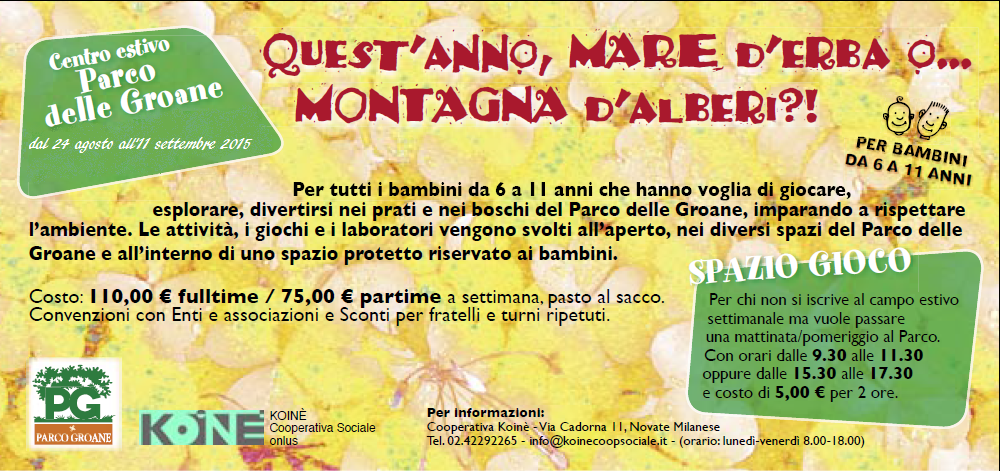 E non dimenticate il grande appuntamento con i campi estivi dedicati a tutti i bambini dai 6 agli 11 anni in programma dal 24 agosto all’11 settembre. Per arrivare a scuola rilassati e divertirsi nel verde del Parco delle Groane.