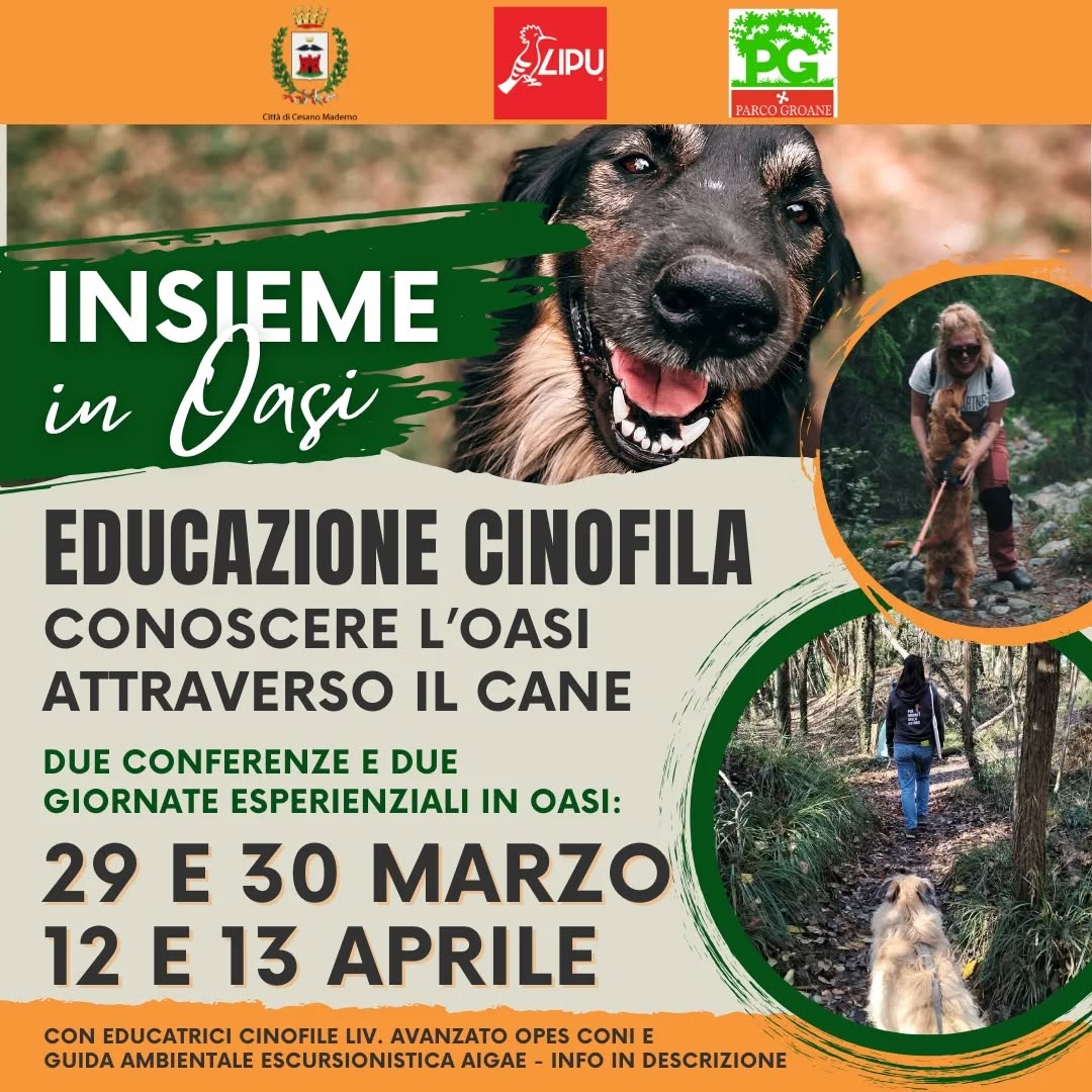 “Insieme in Oasi” – Conoscere l’Oasi attraverso il cane. Il nostro cane è un compagno di vita, è un amico prezioso. Vivere l’ambiente naturale con lui può essere un’esperienza estremamente appagante, significa condividere con lui emozioni, esperienze, scoperte. Imparare ad osservare il nostro cane in ambiente naturale può insegnarci tanto su di lui e sul selvatico che vive nei luoghi che esploriamo. Imparare, conoscere, con consapevolezza e rispetto, per migliorare la relazione con il nostro cane ma anche con l’ambiente circostante. L’Oasi Lipu di Cesano Maderno organizza un ciclo di incontri di educazione cinofila, durante i quali si esplorerà il mondo del cane e le sue modalità di scoperta dell’ambiente naturale. La natura non sarà più soltanto una cornice ma diventerà elemento attivo nella relazione persona-cane.
