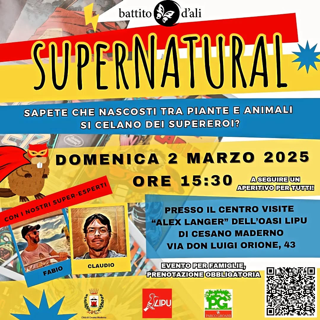 L’Oasi Lipu di Cesano Maderno ha il piacere di ospitare un evento dell’Associazione “Battito d’Ali”, dedicato a famiglie con presentazione e laboratorio sul tema: i super poteri della natura. Durante la presentazione verrà dimostrato come molti dei superpoteri dei supereroi più famosi del cinema e dei fumetti siano già presenti in molte specie di piante e animali. A seguito della presentazione ci sarà un laboratorio sull’argomento. Alla fine dell’attività è previsto un aperitivo per i partecipanti.