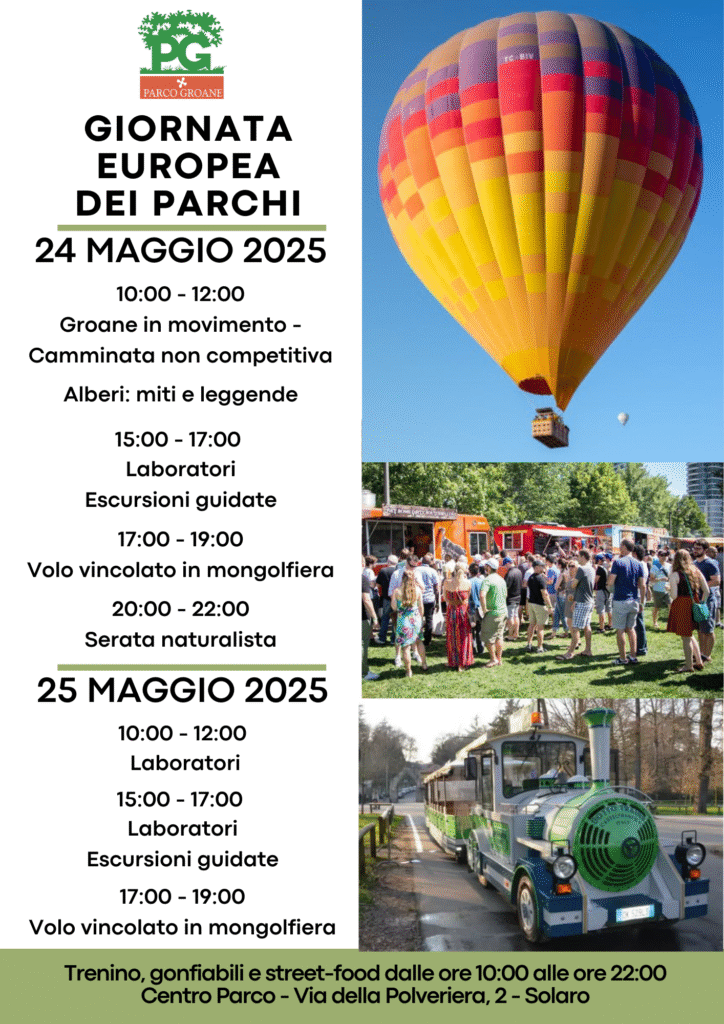 Sabato 24 maggio si comincia alle 10.00 con “Groane in movimento” e un laboratorio dedicato a “Alberi: miti e leggende”. Dalle 15.00 alle 17.00 spazio alle escursioni guidate nei boschi, seguite dal volo in mongolfiera (17.00–19.00) e dalla serata naturalistica (20.00–22.00), pensata per chi vuole approfondire temi ambientali e conoscere meglio la fauna e la flora del parco. Domenica 25 maggio il programma si ripete con laboratori, escursioni e voli in mongolfiera.