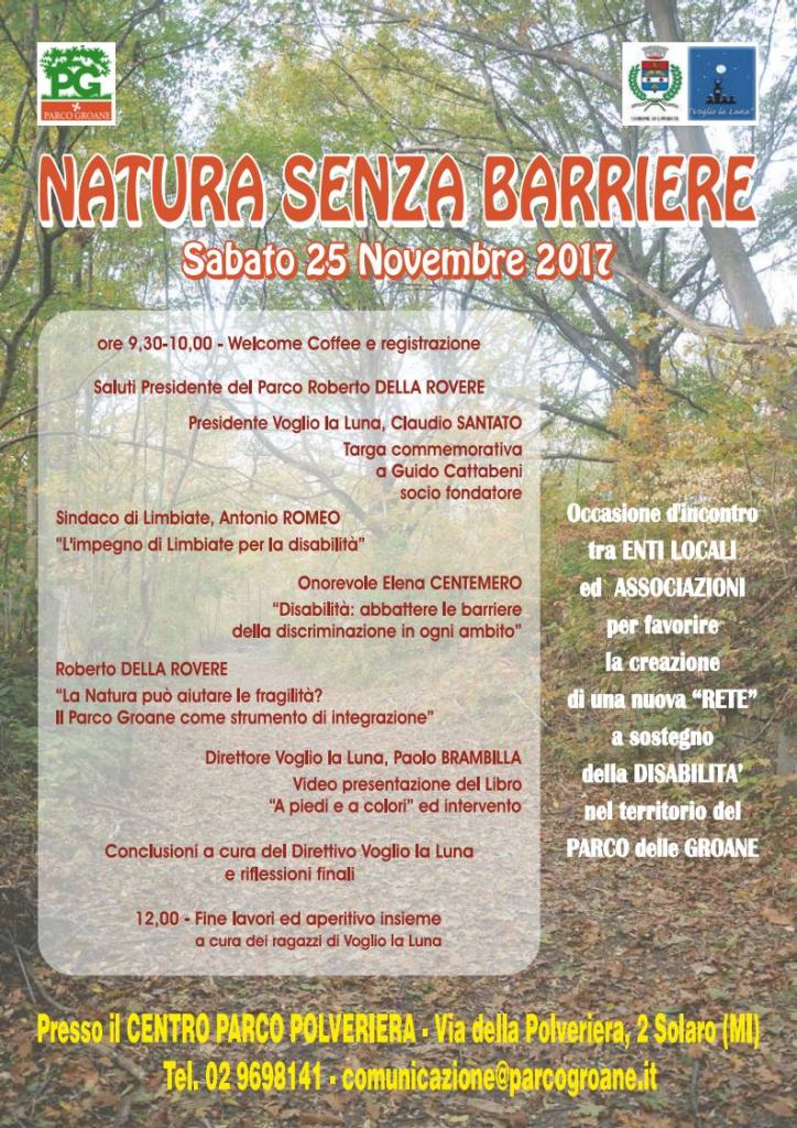 By ComunicazioneIn Eventi e manifestazioni28th novembre, 2017Da oggi sul nostro canale Youtube è online la clip del convegno “Natura senza Barriere” tenutosi sabato mattina 25 Novembre al Centro Parco Polveriera. Potrete ascoltare le dichiarazioni del nostro Presidente Roberto Della Rovere e del Direttore di Voglio La Luna Paolo Brambilla in cui si spiega il progetto che interesserà tutte le associazioni a sostegno della disabilità operanti sul territorio, Paolo Berardi darà anche la data del primo “tavolo” nel mese di gennaio. Potrete ascoltare anche i contributi del sindaco di Limbiate Antonio Romeo e dell’onorevole Elena Centemero, graditi ospiti del convegno.
