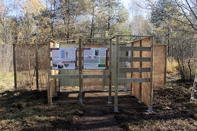 – Zona di osservazione: composta di moduli in legno e cannucciato, con feritoie di osservazione, predisposte ad altezze differenti e dotate di sportellini “apri e chiudi”, proprio per mascherare la presenza degli uomini agli occhi degli scoiattoli.