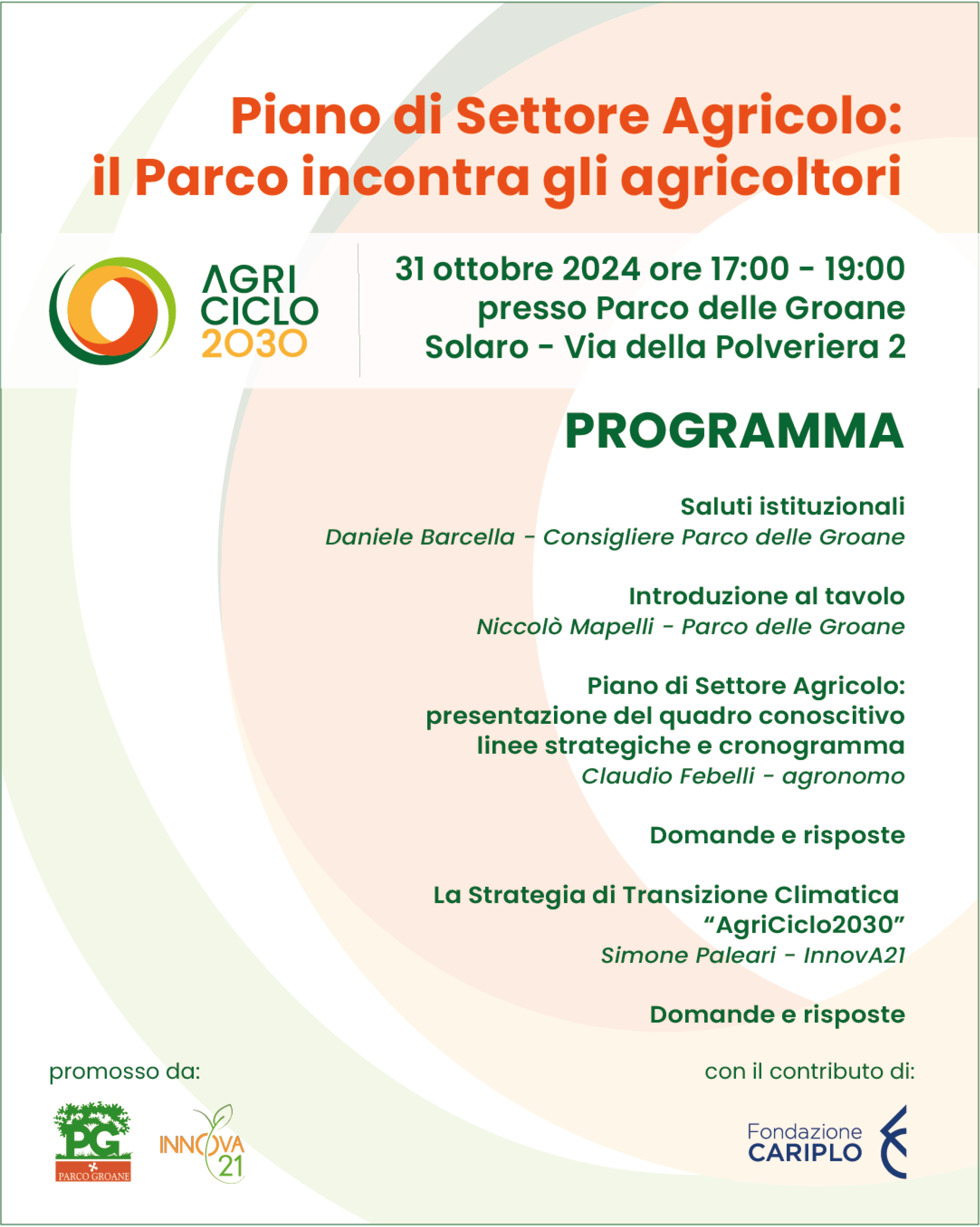 L’appuntamento è per giovedì 31 ottobre dalle 17 alle 19 nell’auditorium del Parco regionale in via della Polveriera 2 a Solaro. Il programma prevede, dopo i saluti istituzionali del consigliere del Parco, Daniele Barcella, l’introduzione del nostro agronomo forestale Niccolò Mapelli, quindi la relazione sul Piano di Settore Agricolo: presentazione del quadro conoscitivo linee strategiche e cronogramma a cura dell’agronomo Claudio Febelli. Seguirà la relazione di Simone Paleari di InnovA21 “La Strategia di Transizione Climatica AgriCiclo2030”. Al termine di ciascun intervento è previsto un momento di dibattito con la possibilità di porre domande da parte dei partecipanti.