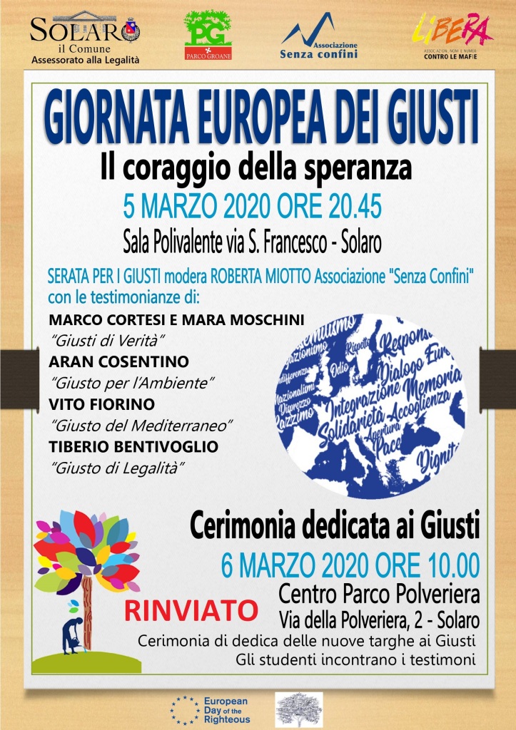 Giornata E. Giusti 2020Si comunica che l’evento in programma venerdì 6 Marzo presso il Centro Parco Polveriera in occasione della Giornata Europea dei Giusti – di cui erano già state affisse le locandine – è stato rinviato. Già fissata la nuova data: venerdì 15 maggio alle 10.
