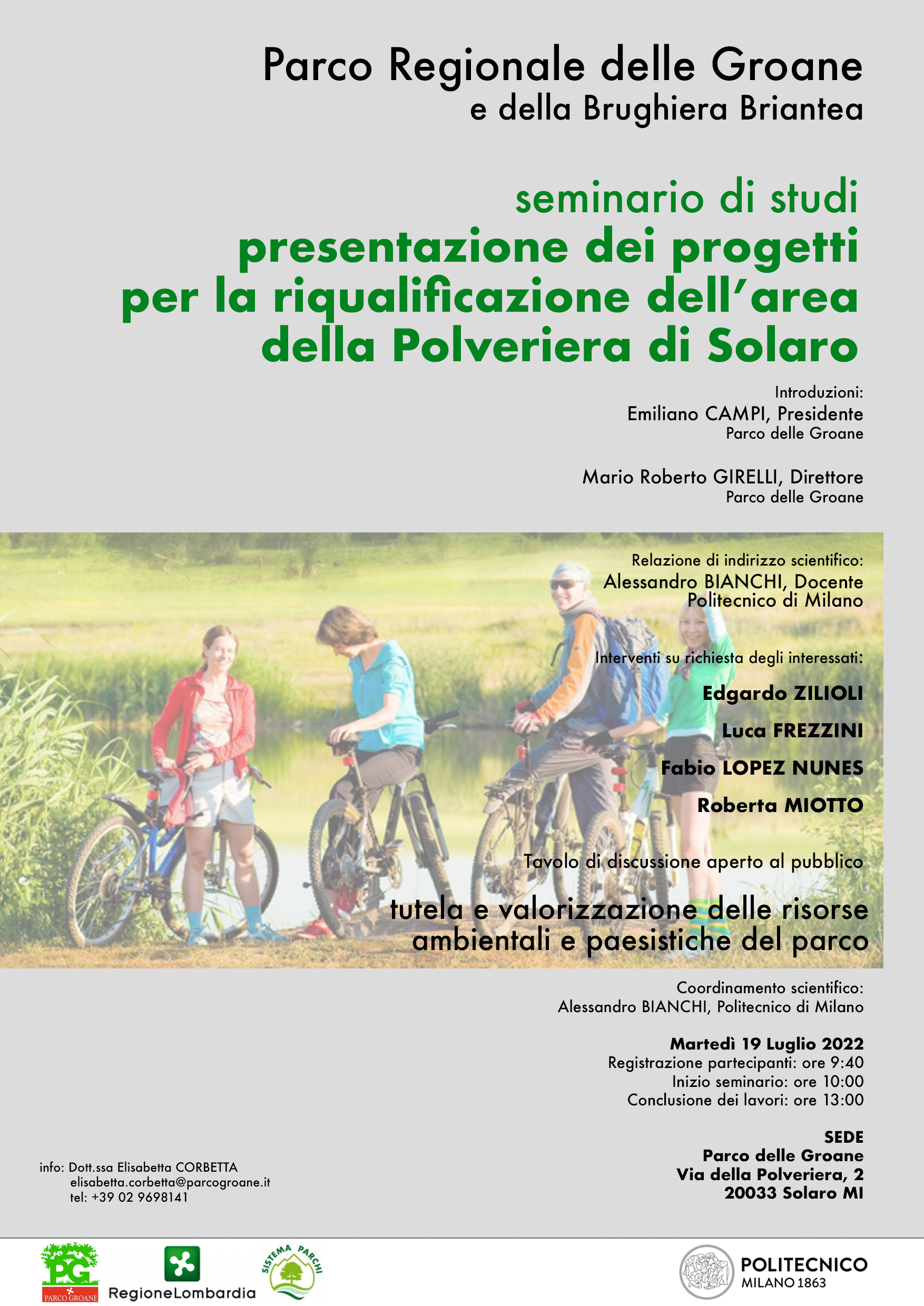 Martedì 19 luglio non dimenticate l’appuntamento nella sede del nostro Parco delle Groane per conoscere le idee di riprogettazione e riqualificazione dell’area dell’ex Polveriera di Solaro. Saranno con noi i professionisti che hanno operato sull’ex polveriera e ne hanno a cuore lo sviluppo. Il seminario è organizzato con la collaborazione del Politecnico di Milano e si apre alle 10. Nell’immagine il programma completo con i relatori e le modalità di partecipazione. Vi aspettiamo!