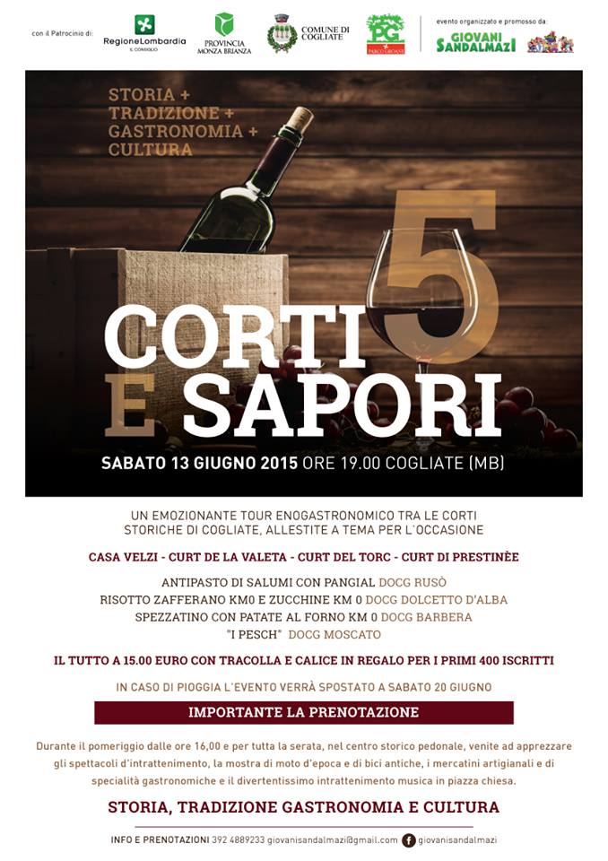 C’è anche il patrocinio del Parco delle Groane alla quinta edizione di Corti e Sapori organizzata a Cogliate dai Giovani Sandalmazi e in programma sabato 13 giugno. La manifestazione è strutturata in un tour enogastronomico all’interno di quattro corti storiche del paese, in ognuna verrà distribuita una portata con vino abbinato. Quest’anno per ovviare al problema del sole e del caldo di mezzogiorno, la manifestazione si svolgerà durante il pomeriggio e la sera, in un’atmosfera suggestiva e avvolgente.