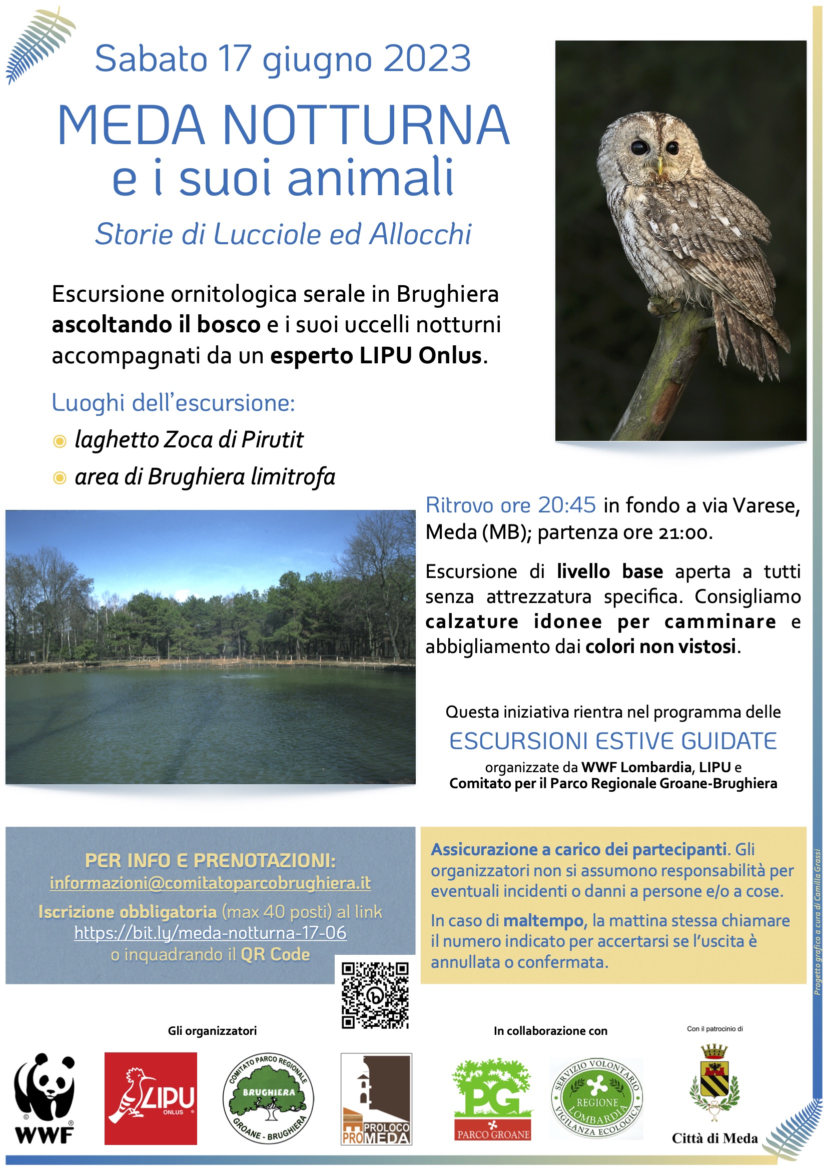 I posti sono limitati a 40, quindi il consiglio è di non attendere troppo ad iscriversi. Per informazioni e prenotazioni si può scrivere a informazioni@comitatoparcobrughiera.it o andare direttamente al link https://bit.ly/meda-notturna-17-06 raggiungibile anche inquadrano il Qr-Code presente nella locandina con uno smartphone collegato a Internet. L’evento è organizzato in collaborazione con la Pro Loco Pro Meda, il nostro Parco delle Groane, le sue Gev e la Città di Meda. Parco e Comune hanno concesso il patrocinio all’evento.