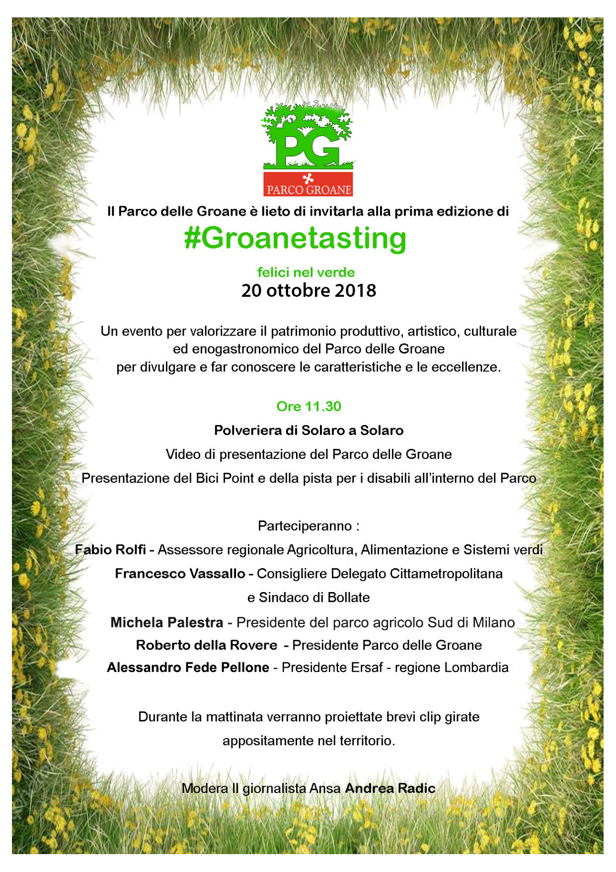 Invito pubblicoUna giornata intera nelle Groane sabato 20 ottobre. Un evento per valorizzare il patrimonio produttivo, artistico, culturale ed enogastronomico del Parco delle Groane per divulgare e far conoscere le caratteristiche e le eccellenze. Ci sarà anche un convegno alle 11.30 presso il Centro Parco Polveriera di Solaro con tanti ospiti.