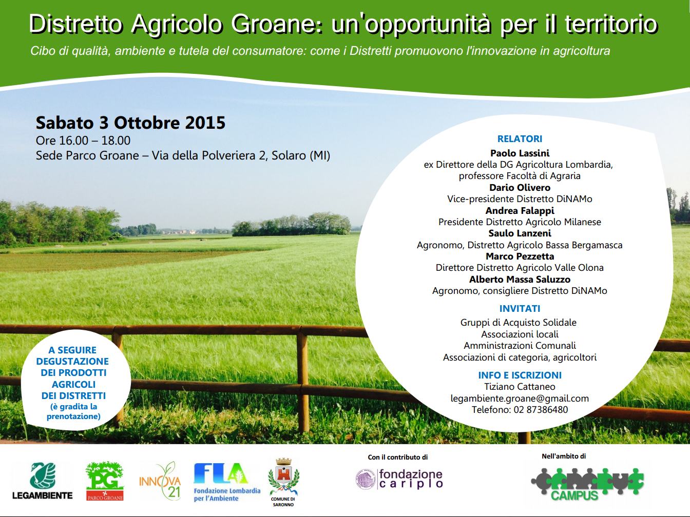 Sabato 3 ottobre presso il salone polifunzionale della nostra sede ospiteremo un convegno promosso da Legambiente Lombardia nell’ambito del progetto Campus, con la collaborazione del circolo Legambiente Groane, dal titolo: “Distretto Agricolo delle Groane: un’opportunità per il territorio. Cibo di qualità, ambiente e tutela del consumatore: come i distretti promuovono l’innovazione in agricoltura”. Il via agli interventi alle 16, alle 18 si conclude con una degustazione dei prodotti agricoli dei distretti.