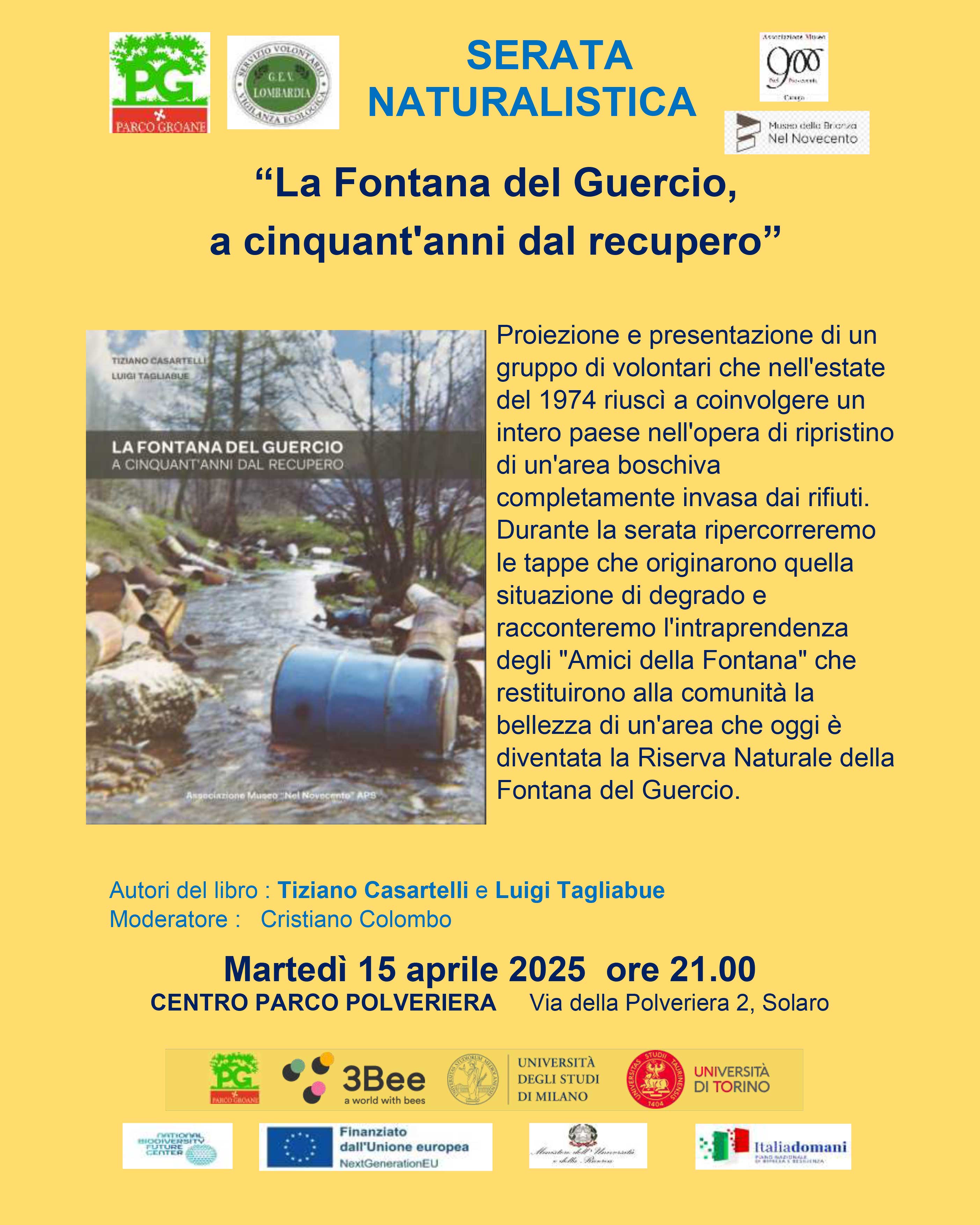 Il secondo appuntamento sarà invece un focus su uno dei luoghi più visitati e delicati del nostro Parco, la Fontana del Guercio. “La Fontana del Guercio, a cinquant’anni dal recupero” il titolo della serata prevista martedì 15 aprile, sempre alle 21 nell’auditorium del Centro Parco Polveriera di Solaro. Si potrà assistere alla presentazione dell’omonimo recentissimo libro, con la proiezione e la presentazione realizzata un gruppo di volontari che nell’estate del 1974 riuscì a coinvolgere un intero paese nell’opera di ripristino di un’area boschiva completamente invasa dai rifiuti. Durante la serata verranno ripercorse le tappe che originarono quella situazione di degrado e sarà raccontata l’intraprendenza degli “Amici della Fontana”, che restituirono alla comunità la bellezza di un’area che oggi è diventata la Riserva Naturale della Fontana del Guercio. Saranno presenti autori del libro: Tiziano Casartelli e Luigi Tagliabue. Modera la serata Cristiano Colombo.