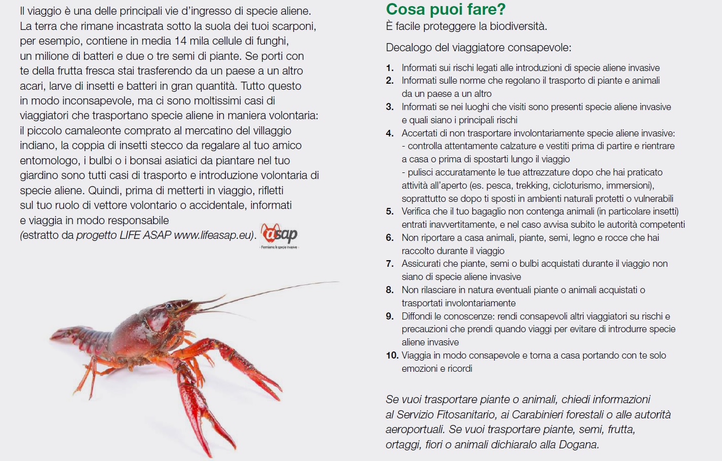 La stra-grande maggioranza delle specie aliene arriva in un nuovo territorio attraverso il trasporto accidentale. E uno dei mezzi più comuni sono i bagagli dei viaggiatori (negli USA il 7️3% delle specie aliene passa dagli aeroporti e il 6️2% viene scovata nei bagagli). Proprio per questo motivo attraverso il progetto Life Gestire 2020 è stata promossa una campagna informativa rivolta agli utenti dell’aeroporto di Orio al Serio, il secondo scalo in Italia per trasporto passeggeri e terzo per traffico merci. La campagna è partita nel mese di agosto 2018, in seguito è stato costituito un presidio integrato, composto dai Carabinieri Forestali e dall’ERSAF con la collaborazione di Agenzia Delle Dogane, SACBO e Guardia di Finanza per verificare l’ingresso delle specie aliene invasive.