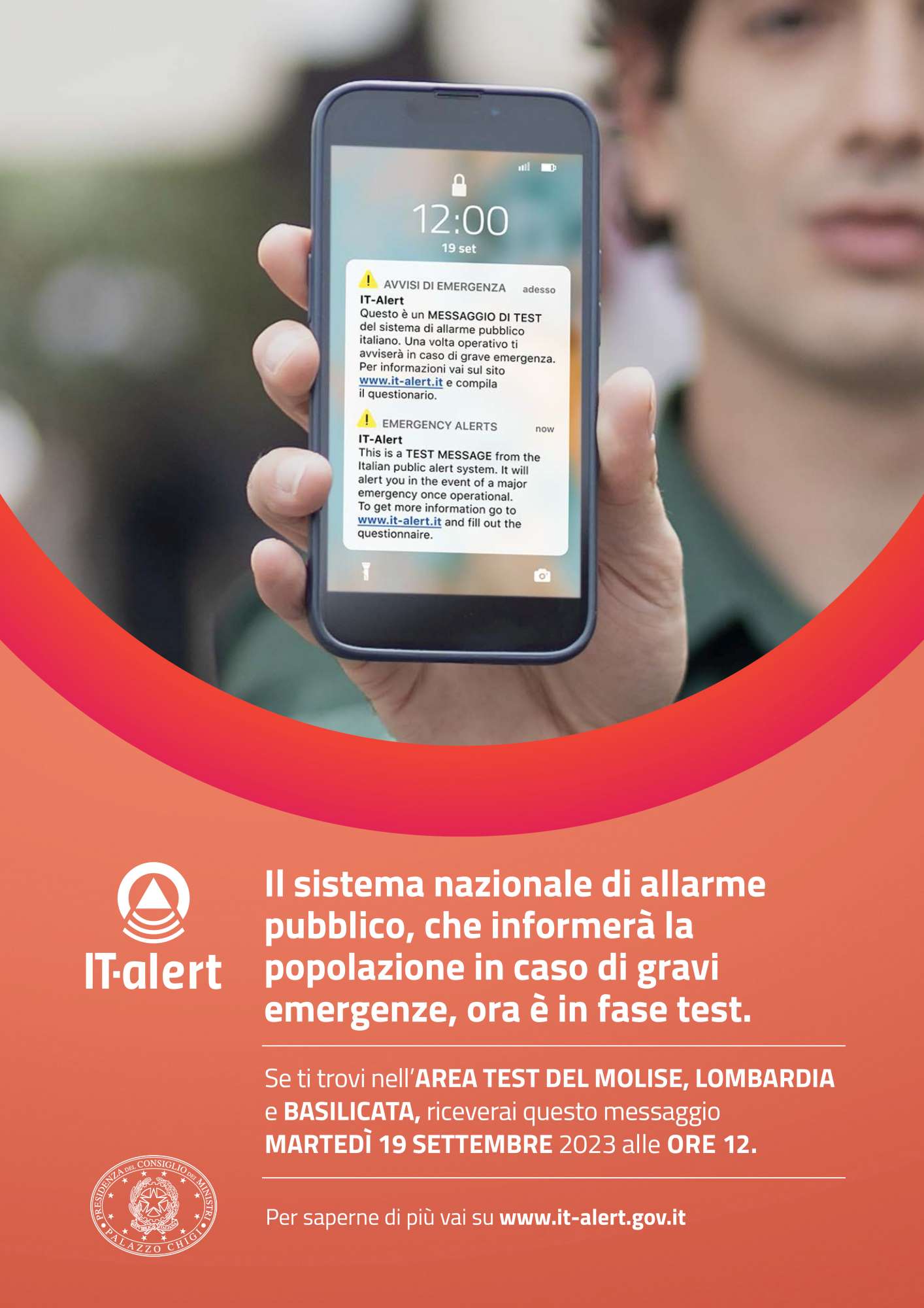 IT-alert è il sistema di allarme pubblico che, nei casi di gravi emergenze e catastrofi imminenti o in corso, permette la diffusione di allarmi pubblici attraverso la trasmissione di messaggi denominati “Messaggi IT-alert” sui cellulari.