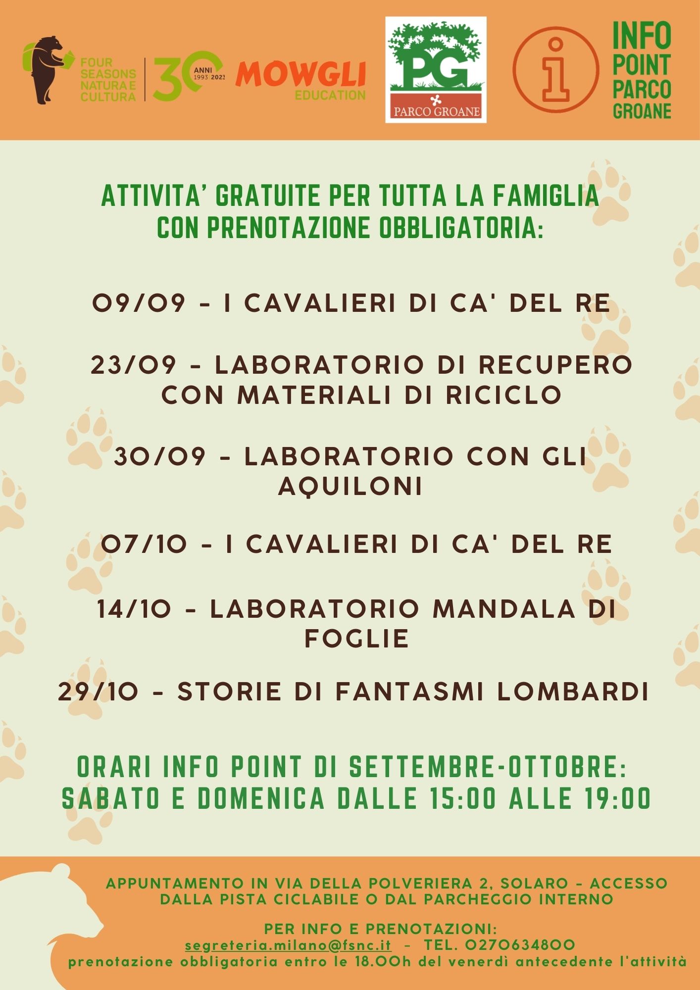 L’Info Point è aperto il sabato e la domenica dalle 15 alle 19. Ci trovate in via della Polveriera 2, a Solaro (Milano) con accesso sia dalla pista ciclabile sia dal parcheggio interno.