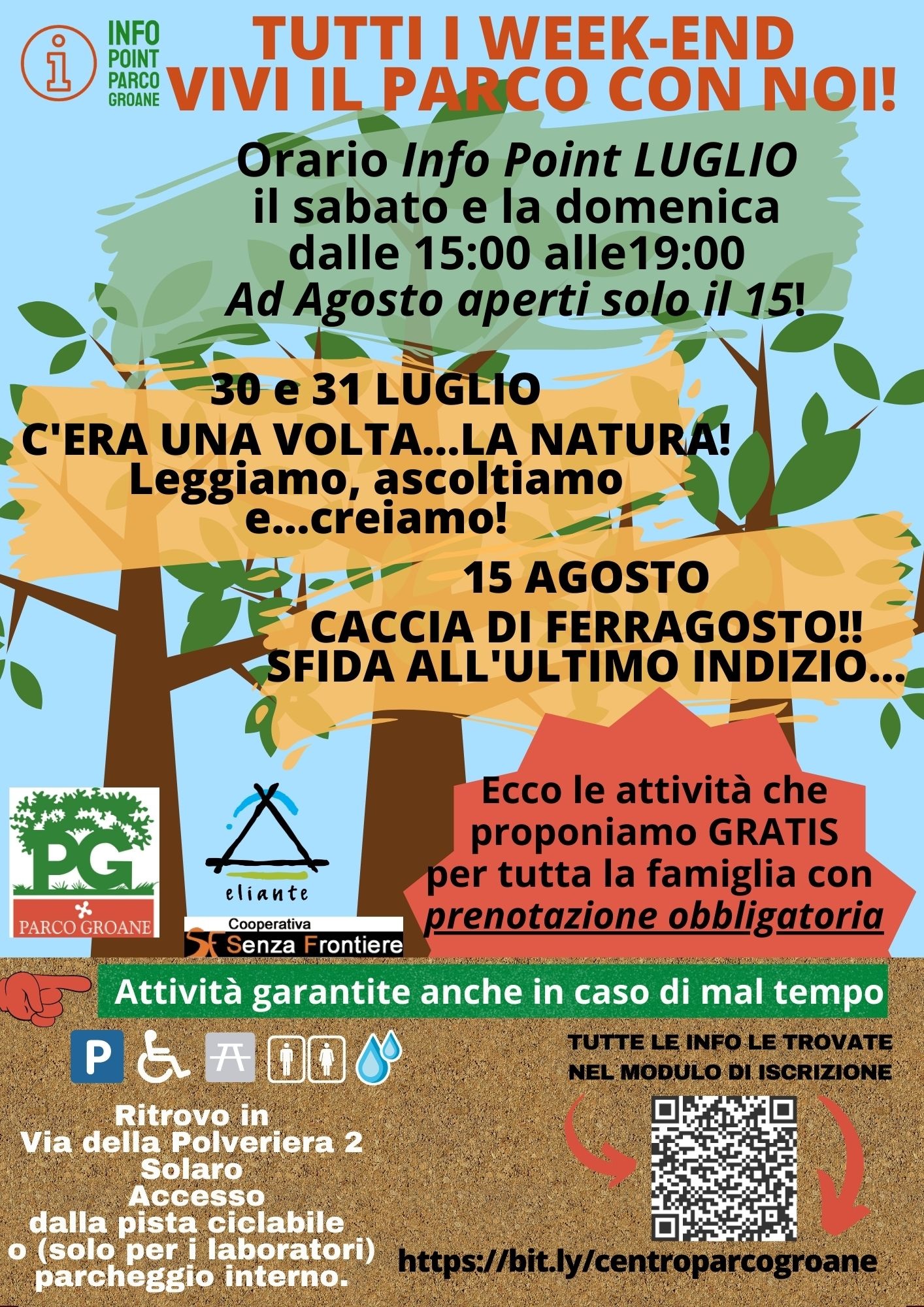 “C’era una volta… la natura! Leggiamo, ascoltiamo e creiamo”. Per iscrivervi all’evento del 30 e 31 luglio basta inquadrare il QrCode sulla locandina. La prenotazione è obbligatoria. A Ferragosto siamo pronti invece per una bellissima caccia al tesoro. Una sfida all’ultimo indizio. Cosa aspettate ad iscrivervi? I posti sono limitati. Noi vi aspettiamo qui all’Info Point di Solaro, in via Polveriera 2, con tutta la simpatia dei nostri obiettori e degli operatori delle cooperative che collaborano con il Parco delle Groane e della Brughiera Briantea.