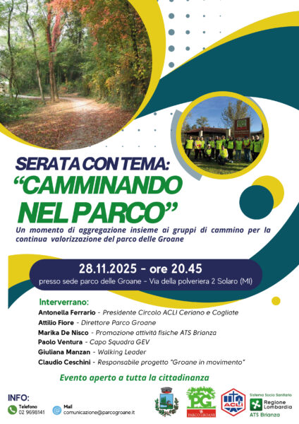La serata prosegue un percorso avviato a fine ottobre, con il patrocinio del Parco al coordinamento dei gruppi di cammino e la consegna delle nuove pettorine da parte del direttore generale Attilio Fiore. Un segnale di attenzione verso una comunità sempre più attiva, sostenuta anche dall’esperienza di “Groane in Movimento”.
