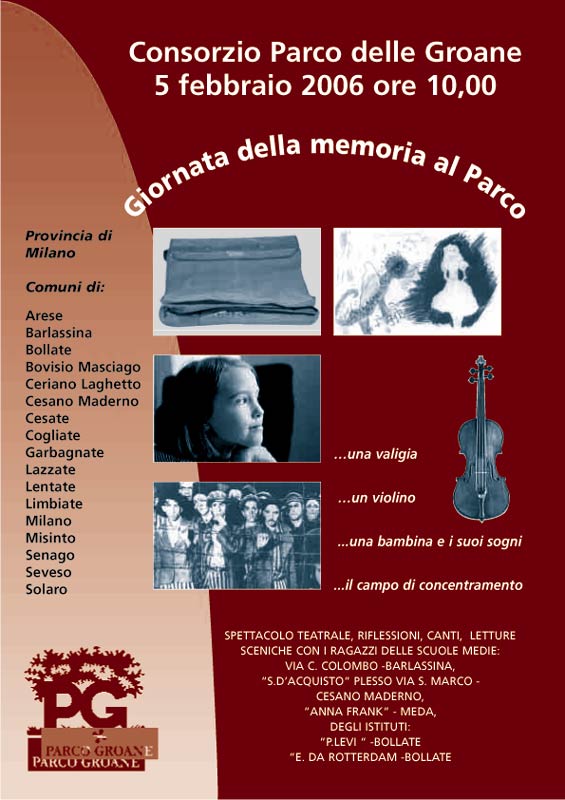 Anche questanno il Consorzio Parco delle Groane intende celebrare presso la sede di Solaro la Giornata della Memoria, istituita dal Parlamento italiano nellanno 2000, per ricordare lo sterminio e le persecuzioni del popolo ebraico e dei deportati militari e politici nei campi nazisti.