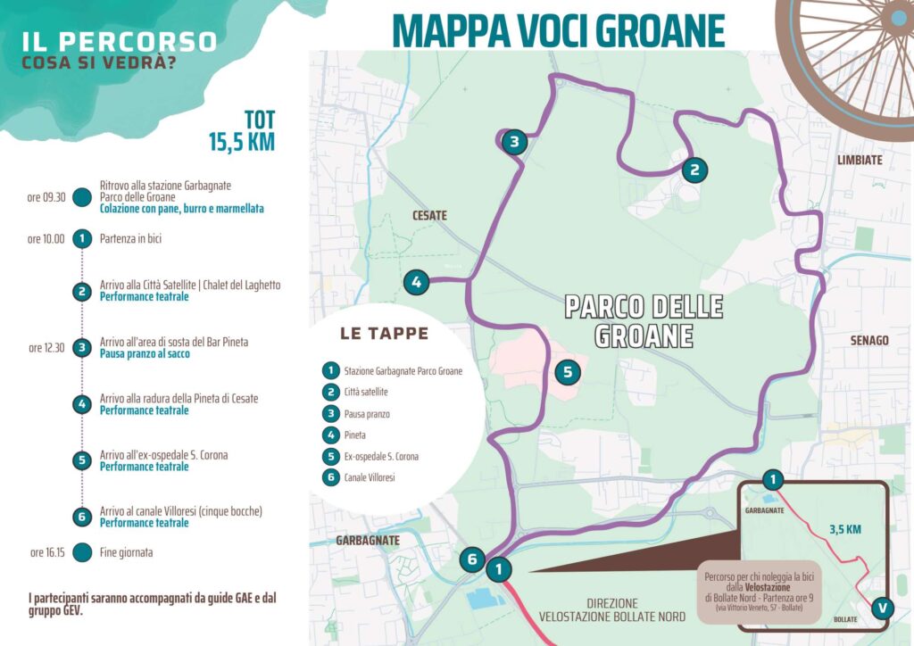 La formula è semplice e avvincente: un percorso ciclabile di 15,5 chilometri attraverso piste sterrate e ciclovie del Parco, con sei tappe scandite da brevi performance site-specific a cura di attori e autori di Teatro Periferico, accompagnati dalle (GAE) Guide ambientali escursionistiche e dalle Gev Guardie ecologiche volontarie del Parco delle Groane e della Brughiuera Briantea. Si parte alle 9.30 dalla stazione ferroviaria Garbagnate Parco delle Groane, dove i partecipanti troveranno pane, burro e marmellata per una colazione all’italiana.