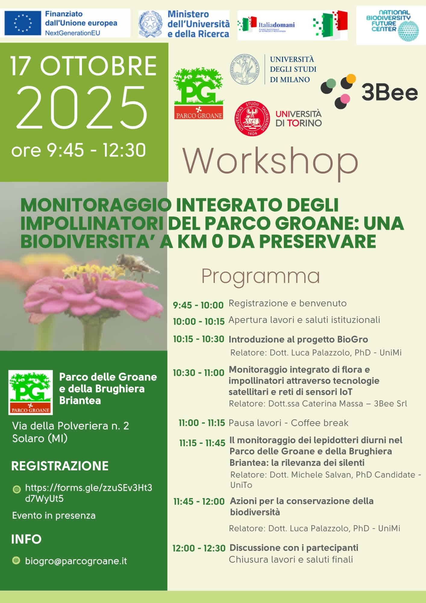 L’incontro rientra nel progetto BioGro, finanziato dal National Biodiversity Future Center (NBFC) del PNRR, e rappresenta un importante momento di confronto tra enti, università e ricercatori impegnati nella tutela della biodiversità locale. Il Parco è capofila del progetto insieme con l’Università degli Studi di Milano, l’Università di Torino e con 3Bee, conferma così il proprio impegno a favore della conservazione della natura e della valorizzazione del territorio, con il sostegno dell’Unione europea – NextGenerationEU e del Ministero dell’Università e della Ricerca.